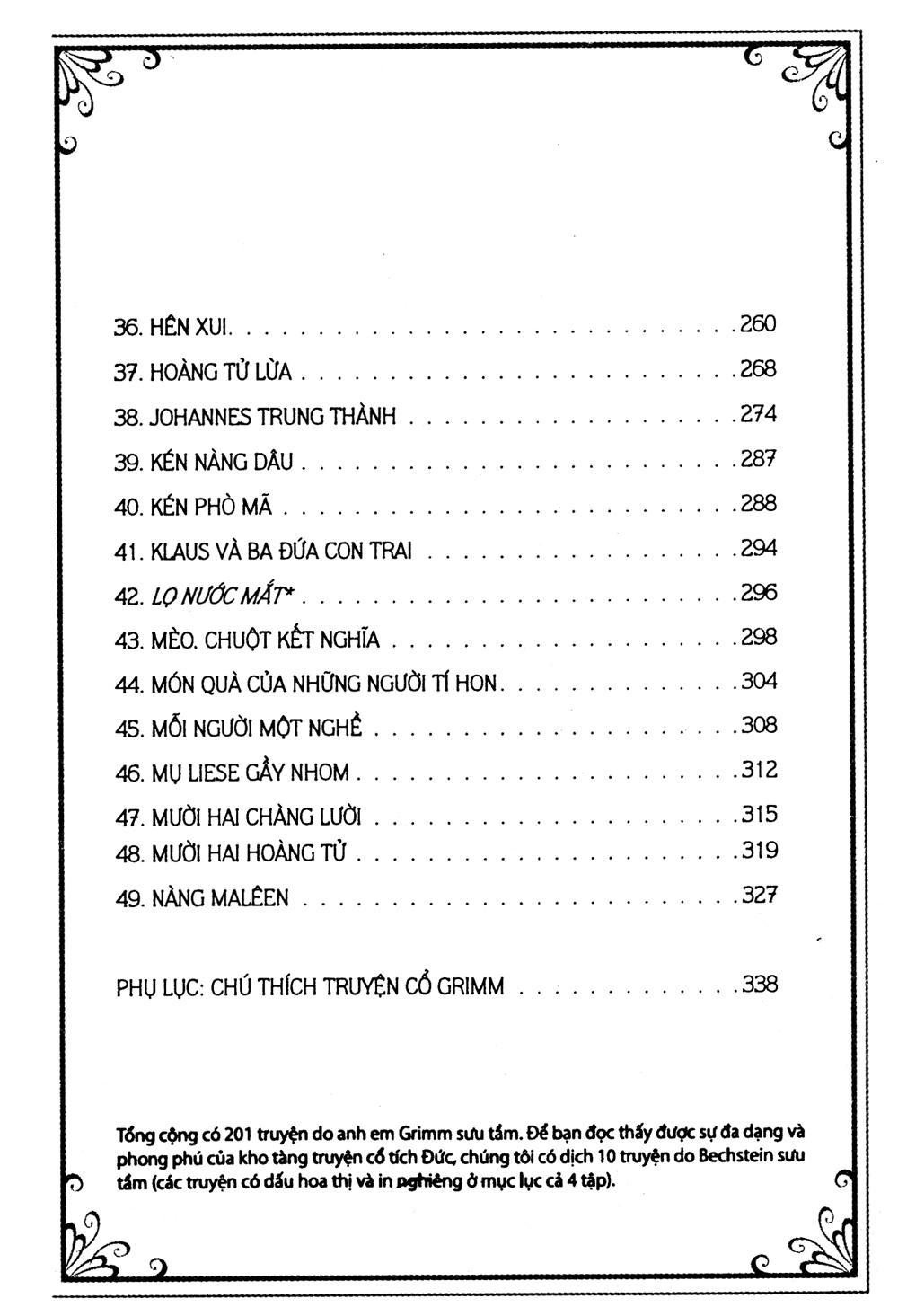 “Truyện cổ Gimm” là một trong số ít những tác phẩm được dịch ra nhiều thứ tiếng nhất trên thế giới. Gần hai thế kỉ sắp qua từ ngày tập truyện cổ dân gian Đức do anh em Grimm sưu tầm ra đời, tác phẩm này vẫn là một nguồn cảm hứng dồi dào, mang lại cho bạn đọc niềm vui vô tận, nhắc nhở mọi thế hệ trên toàn cầu một đạo lí nhân bản.