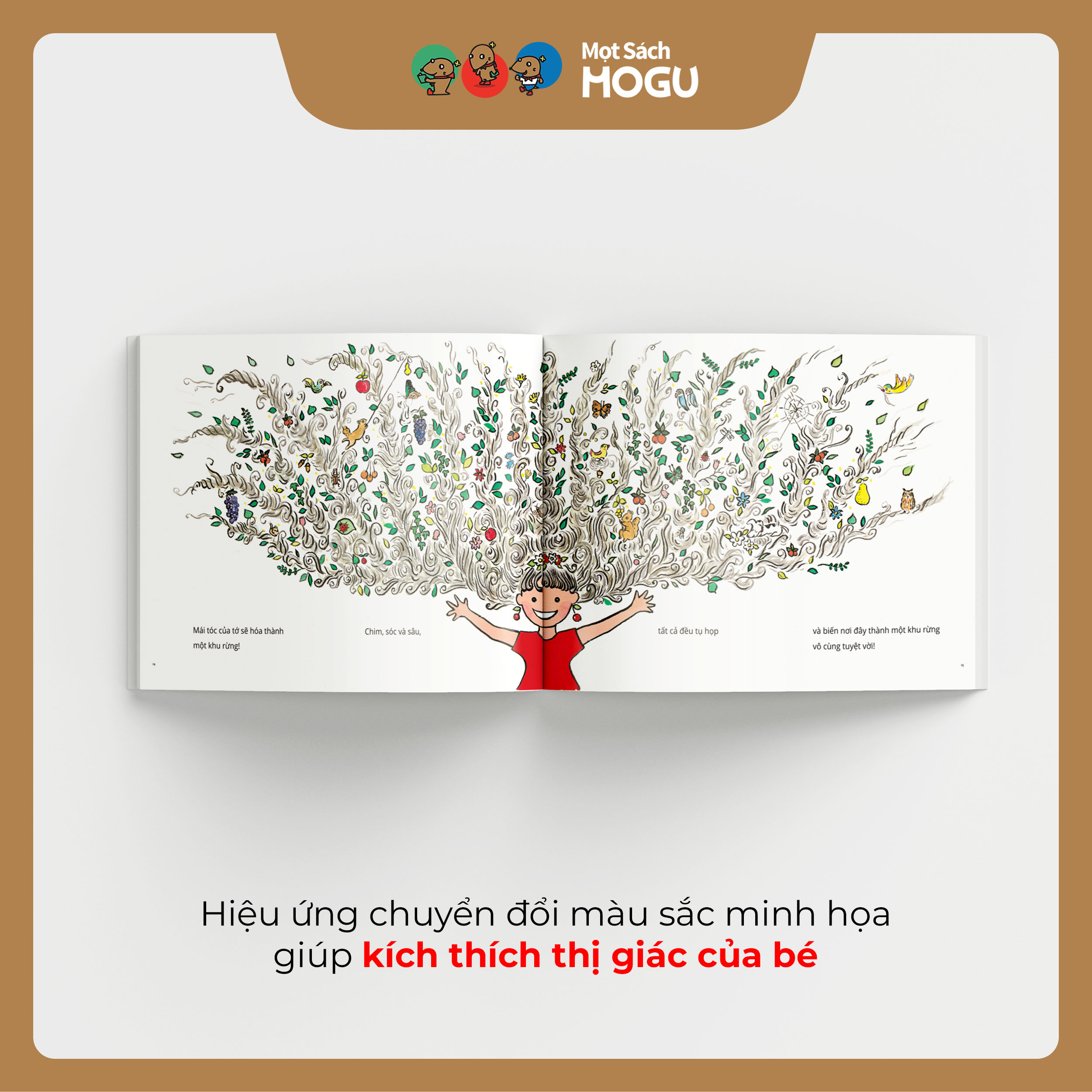 Minh họa tươi sáng, bắt mắt: Màu sắc rực rỡ thu hút sự chú ý, kích thích thị giác và cảm xúc của bé.