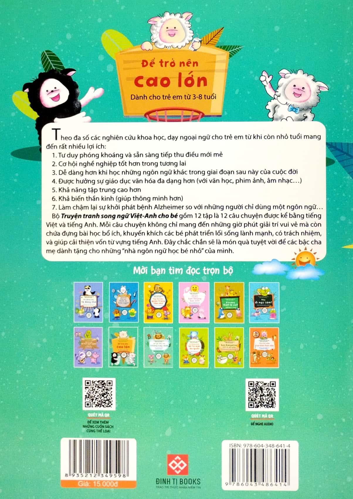 Bộ Truyện tranh song ngữ Việt - Anh cho bé gồm 12 tập là 12 câu chuyện được kể bằng tiếng Việt và tiếng Anh. Mỗi câu chuyện không chỉ mang đến những giờ phút giải trí vui vẻ, mà còn chứa đựng bài học bổ ích, khuyến khích các bé phát triển lối sống lành mạnh, có trách nhiệm, và giúp cải thiện vốn từ vựng tiếng Anh. Đây chắc chắn sẽ là món quà tuyệt vời để các bậc cha mẹ dành tặng cho những “nhà ngôn ngữ học bé nhỏ” của mình.