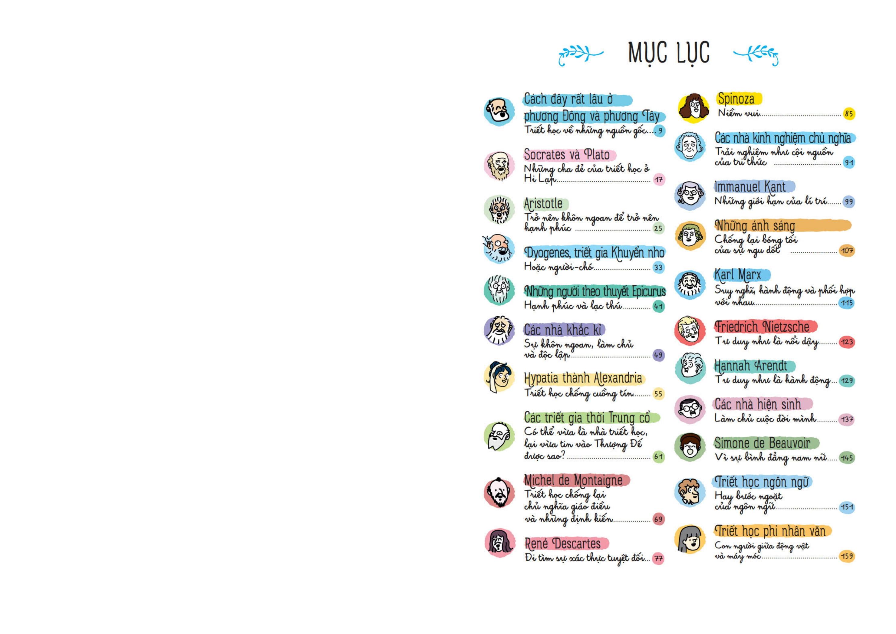 Truyện Tranh Triết Học Cho Trẻ Em, Và Cả… Cho Người Lớn - Các Nhà Hiền Triết Bất Kham Suy tư triết học chính là chống lại những định kiến, những lối mòn suy ngẫm chẳng ai thắc mắc, những thói quen làm người ta mê muội. Không bằng lòng với thực tại sẵn có, với những định kiến ngàn đời, các nhà hiền triết đưa ra những quan niệm mới, những tư tưởng mới. Không chỉ có vậy, họ hành động, đấu tranh để bảo vệ quan điểm của m.ình. Họ được gọi là những người “bất kham”, nghĩa là không chịu phục tùng. Đúng vậy, họ không chịu phục tùng những định kiến xấu, những lề thói kìm hãm con người. Hãy cùng tìm hiểu những tư tưởng đi ngược đám đông, vượt trước thời đại của các triết gia nổi tiếng với bộ sách Truyện Tranh Triết Học Cho Trẻ Em, Và Cả… Cho Người Lớn sắc màu và hài hước nhé!