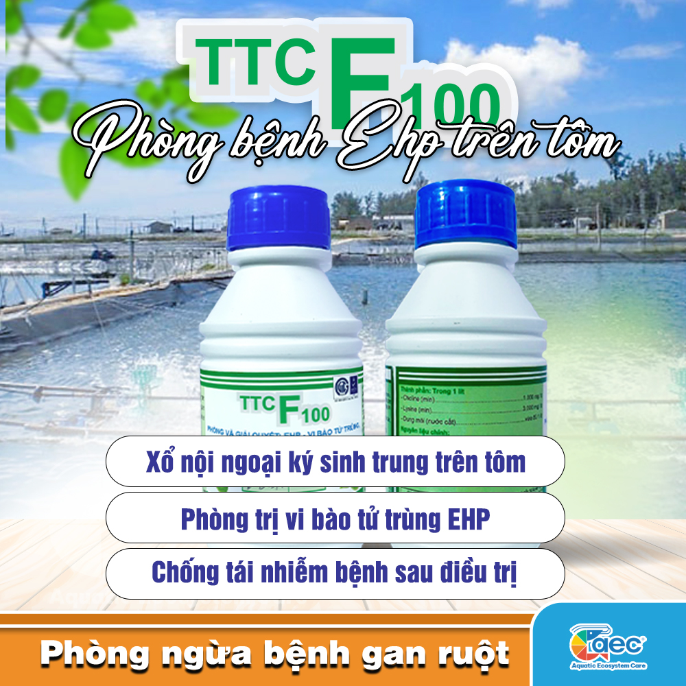 TTC F100 là sản phẩm chiết xuất 100% từ thảo dược tự nhiên như tỏi, hành, trà xanh và một số thảo dược khác, giúp hỗ trợ kiểm soát và giảm nguy cơ EHP trên tôm, đồng thời hạn chế tối đa quá trình tái nhiễm sau khi sử dụng.