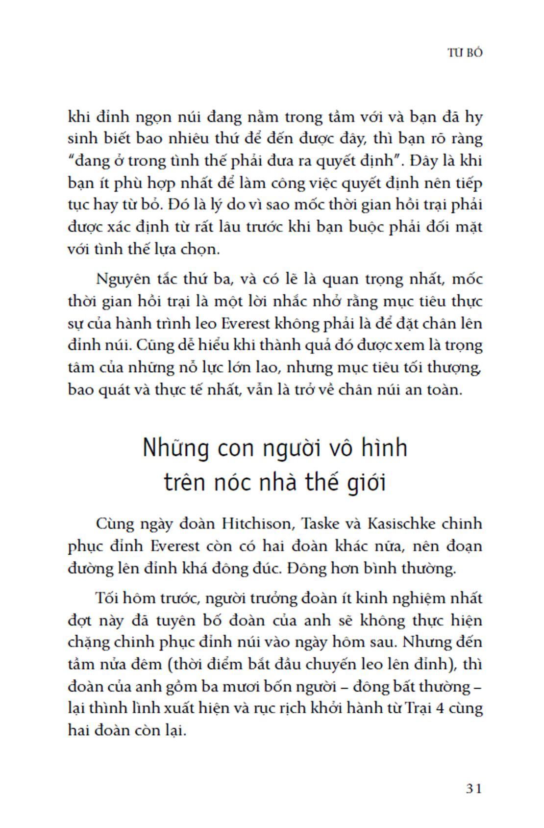 Xuyên suốt mười một chương sách, Annie Duke đ.ã sử dụng những bằng chứng khoa học, những trường hợp điển hình và những phân tích thấu đáo để chỉ ra những sự thật về quyết định từ bỏ. Trong khi kiên trì là một phẩm chất không thể thiếu để đạt đến thành công, thì mặt trái của nó là có thể khiến chúng ta sa lầy vào những nỗ lực không còn xứng đáng. Không ít cá nhân có tên tuổi đã phạm phải sai lầm này và đánh mất cả danh tiếng lẫn cơ hội phát triển. Nhiều doanh nghiệp lớn như Sears, Blockbuster hay chuỗi cửa hàng giảm giá ABC đã tiêu tốn hàng triệu đô-la cố duy trì một mô hình hoặc quy trình đã không còn hoạt động hiệu quả, rốt cuộc dẫn tới kết quả vô cùng đáng tiếc. Chúng ta có tâm lý muốn tiếp tục dồn sức cho một nỗ lực m.ình đã đầu tư quá nhiều mà không nhận ra rằng khi kiên trì với một nỗ lực không còn xứng đáng là ta đang lãng phí thời gian, tiền bạc và năng lượng – những thứ mà lẽ ra ta có thể sử dụng cho một mục tiêu tốt hơn.