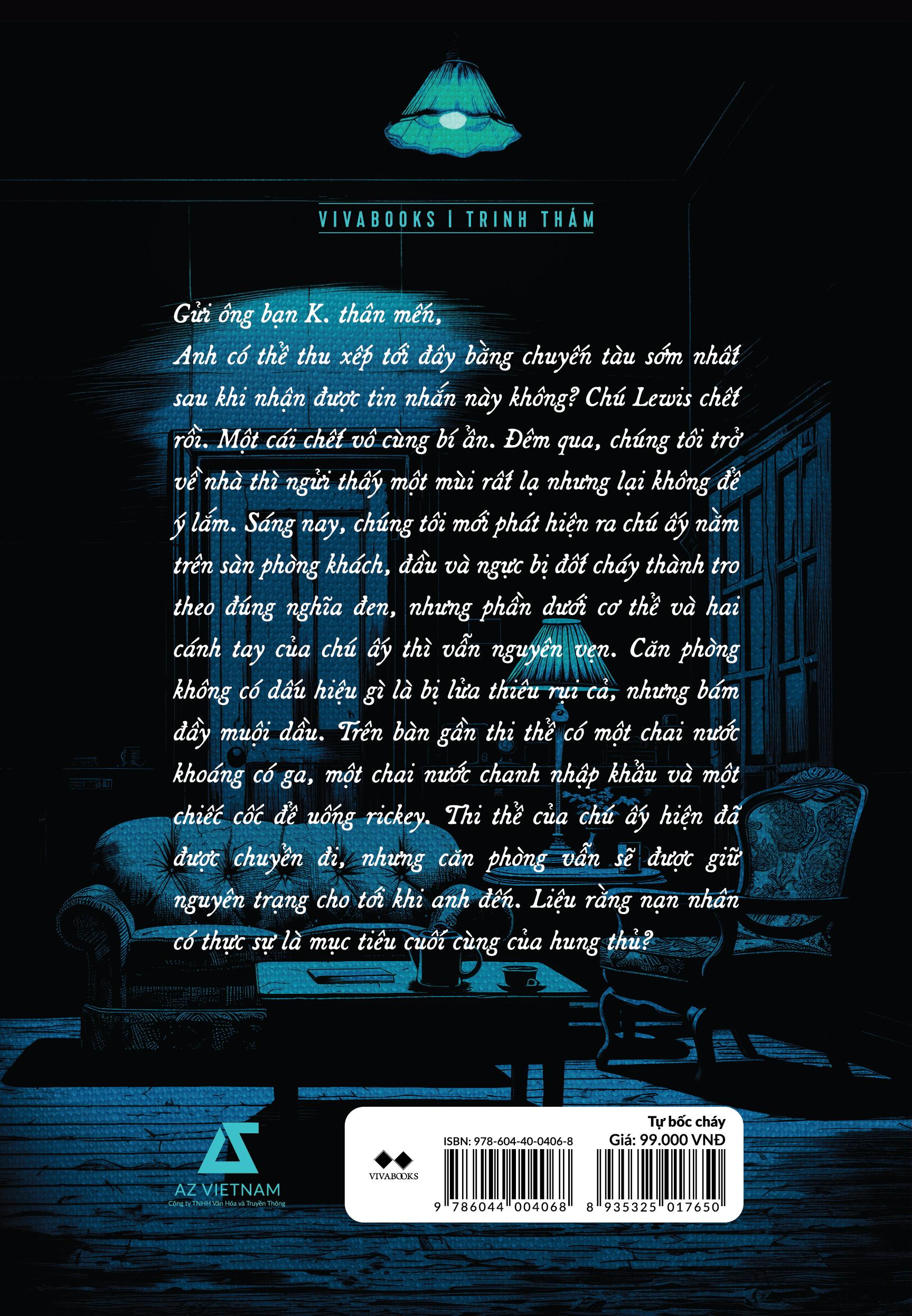 Anh có thể thu xếp tới đây bằng chuyến tàu sớm nhất sau khi nhận được tin nhắn này không? Chú Lewis chết rồi. Một cái chết vô cùng bí ẩn. Đêm qua, chúng tôi trở về nhà thì ngửi thấy một mùi rất lạ nhưng lại không để ý lắm. Sáng nay, chúng tôi mới phát hiện ra chú ấy nằm trên sàn phòng khách, đầu và ngực bị đốt cháy thành tro theo đúng nghĩa đen, nhưng phần dưới cơ thể và hai cánh tay của chú ấy thì vẫn nguyên vẹn. Căn phòng không có dấu hiệu gì là bị lửa thiêu rụi cả, nhưng bám đầy muội dầu. Trên bàn gần thi thể có một chai nước khoáng có ga, một chai nước chanh nhập khẩu và một chiếc cốc để uống rickey. Thi thể của chú ấy hiện đã được chuyển đi, nhưng căn phòng vẫn sẽ được giữ nguyên trạng cho tới khi anh đến…