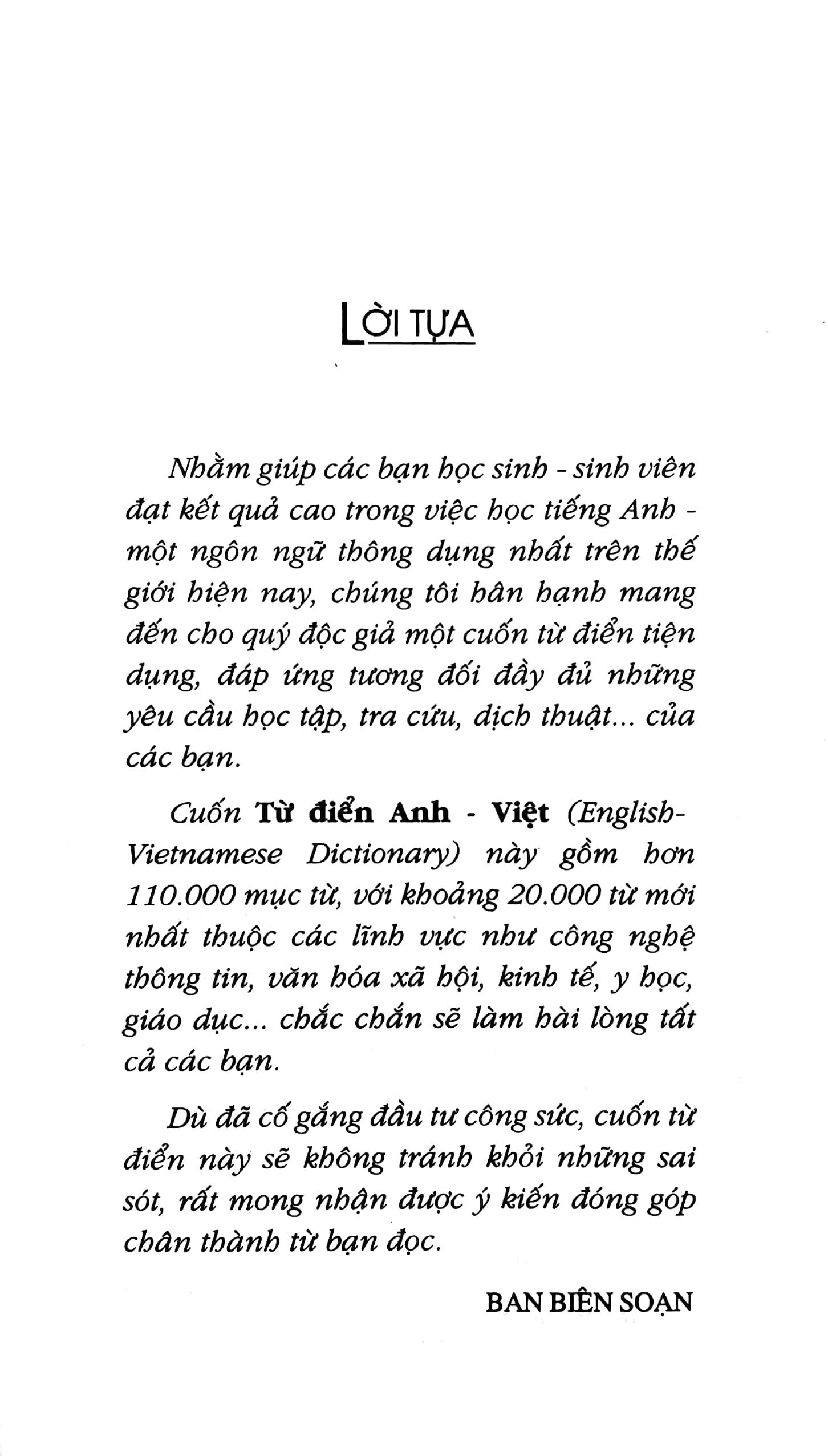 Nhằm đáp ứng nhu cầu học tiếng Anh đa dạng của nhiều người. Nhóm chúng tôi đã biên soạn cuốn từ điển Anh – Việt này để phục vụ cho người học tiếng Anh thuộc