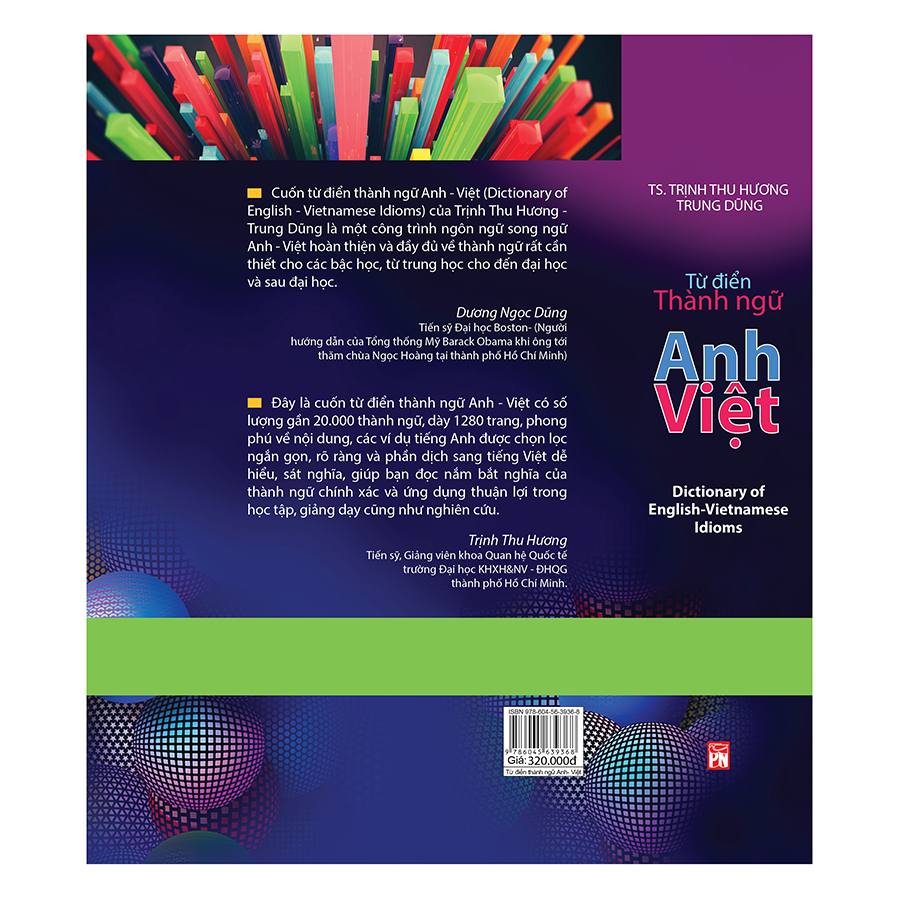 Trong tiếng Anh, việc sử dụng thành ngữ (khi nói và viết) rất quan trọng. Bạn không thể dựa theo những quy tắc ngữ pháp thông thường hay đơn giản là ghép các từ lại mà hiểu được nghĩa của một thành ngữ. Hai tác giả Trịnh Thu Hương và Trung Dũng đã phải trải qua hành trình dài đầu tư thời gian và công sức, trí tuệ để hoàn thành cuốn từ điển thành ngữ Anh - Việt hoàn chỉnh này để mọi người có thể tra cứu phục vụ cho việc học tập ngay tại nhà.