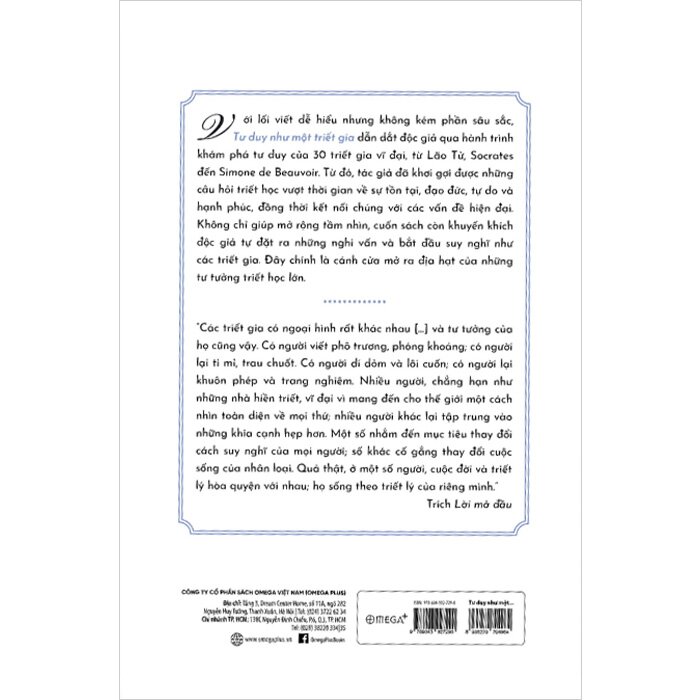 “Tư duy như một triết gia” của tác giả Peter Cave nằm trong bộ sách Tư duy của Omega+, được mua bản quyền từ nhà xuất bản Bloomsbury là một trong những nhà xuất bản nổi tiếng nhất thế giới. Bên cạnh các ấn phẩm phổ thông, Bloomsbury còn tập trung phát triển mảng sách học thuật, mang đến những tác phẩm có giá trị học thuật cao trong các lĩnh vực như triết học, lịch sử, kinh tế, và chính trị. Bộ sách Tư duy gồm có 3 cuốn: “Tư duy như một triết gia” - Peter Cave, "Tư duy như chính trị gia" - Graeme Garrard & James Bernard Murphy, "Tư duy như kinh tế gia" - Robbie Mochrie.