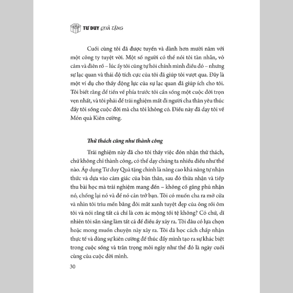 Áp dụng Tư Duy Quà Tặng sẽ giúp bạn đón nhận thử thách và thành công với niềm vui cả trong lẫn ngoài nơi làm việc. Chia sẻ những bài học ta đúc rút được thông qua các món quà không chỉ tiếp thêm sức mạnh cho ta, mà còn có thể trở thành cẩm nang sinh tồn của người khác và giúp tạo ra một văn hóa chia sẻ, cởi mở.