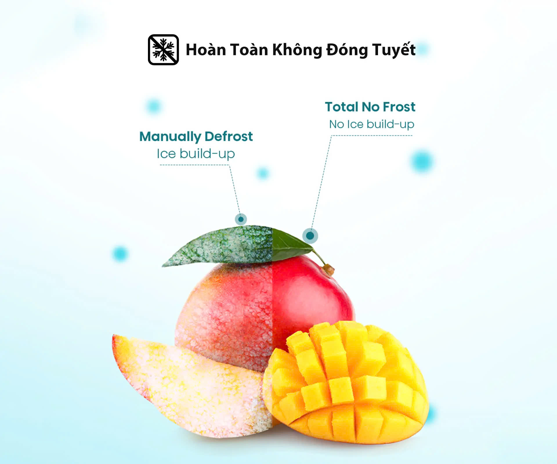 - Công nghệ Total No Frost loại bỏ việc tích tụ đá trong tủ lạnh, giúp bạn không cần phải rã đông thủ công. Điều này cũng giữ cho thực phẩm của bạn tươi ngon và toàn vẹn dưỡng chất trong thời gian dài hơn.