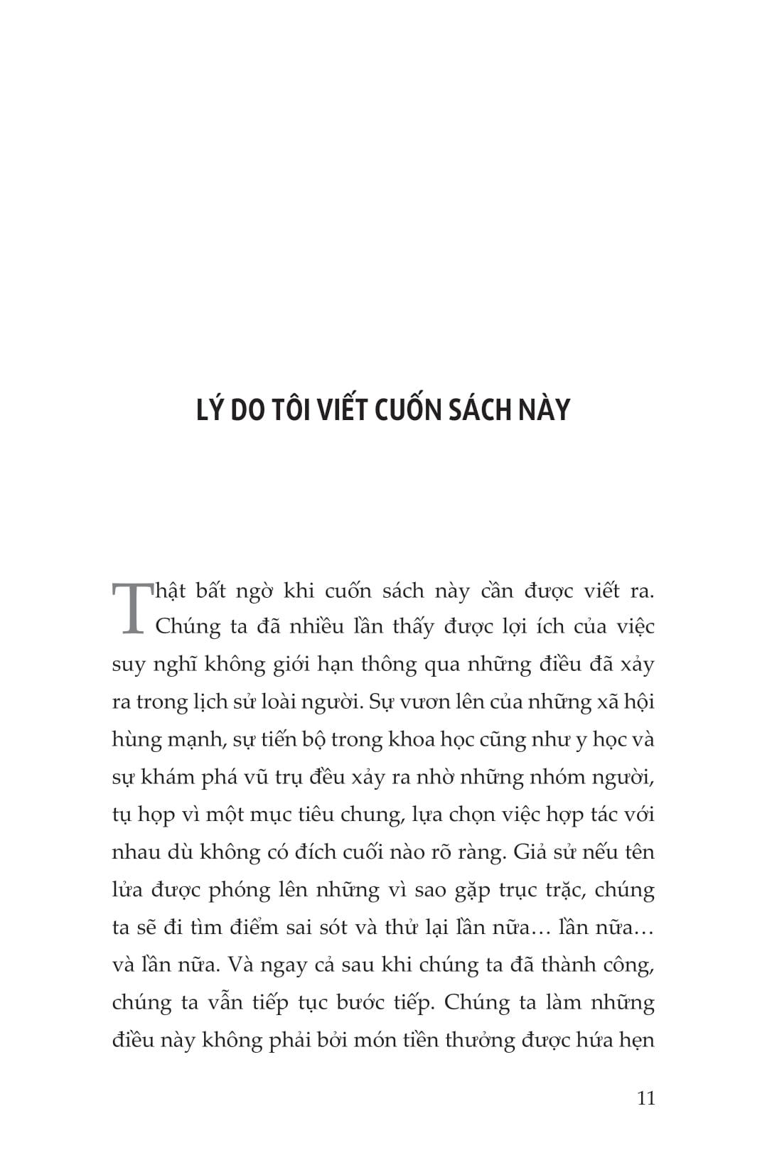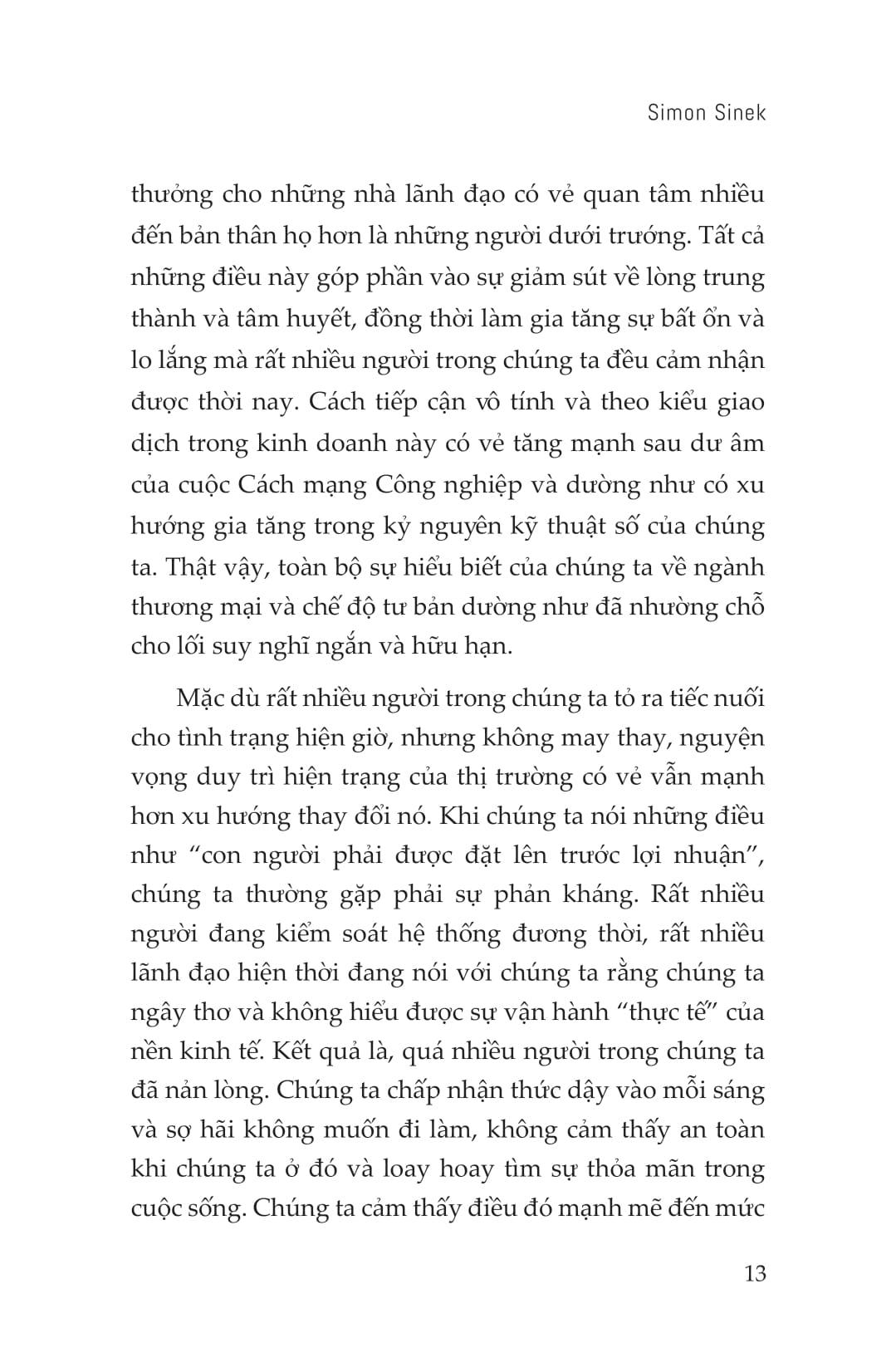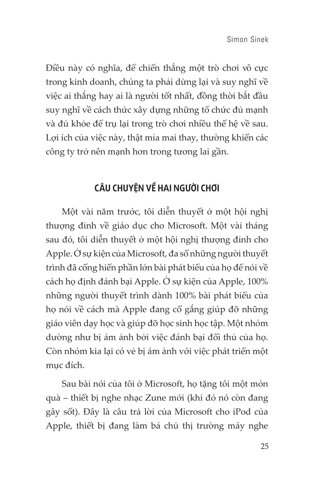 Cuốn sách “Từ mục tiêu ngắn hạn đến mục đích dài hạn” sẽ hướng dẫn bạn cách đúng đắn để chơi trò chơi kinh doanh vô cực này. Qua đó tác giả Simon Sinek đã đưa ra một chiến lược để dẫn đầu với tư duy vô hạn. Những nhà lãnh đạo với lối suy nghĩ vô hạn, sẵn sàng thách thức hiện trạng và thay thế nó với một thực tế mới sẽ có khả năng khiến cho bản ngã con người cố hữu của tất cả chúng ta cảm thấy an toàn hơn, sẵn sàng cống hiến cho một điều gì đó lớn lao hơn chính bản thân và cung dưỡng cho chúng ta cũng như gia đình, để từ đó xây dựng các tổ chức mạnh mẽ hơn và sáng tạo hơn trên toàn thế giới.