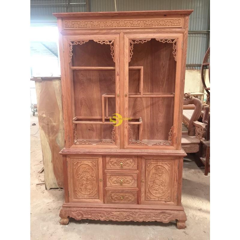 Tủ R gỗ hương 1m2 được thiết kế hình chữ nhật, Phía dưới là cánh và ngăn kéo được đục trạm hoa văn khá tinh tế, tạo nét cổ kính cho sản phẩm