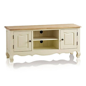 Tủ TV 2 cánh Bella thiết kế đối xứng và cân đối, mang vẻ ngoài tuyệt dẹp của màu sơn trắng kem tuyệt đẹp trên nền chất liệu gỗ sồi trắng Mỹ nhập khẩu thượng hạng. Hai ngăn tủ sẽ là nơi lưu trữ tuyệt vời những sản phẩm âm nhạc yêu thích hay thiết bị điện tử trong phòng khách. Ở giữa là 2 ngăn kệ mở sẽ là nơi để đầu DVD, hộp cáp, bên trong có các lỗ nhỏ để luồn dây điện đúng vị trí và an toàn. Chế tác hoàn mỹ, với những đường cong mềm mại, bắt mắt ở phần đế và chân trụ, mang đặc trưng của bộ sưu tập Bella theo phong cách tân cổ điển.