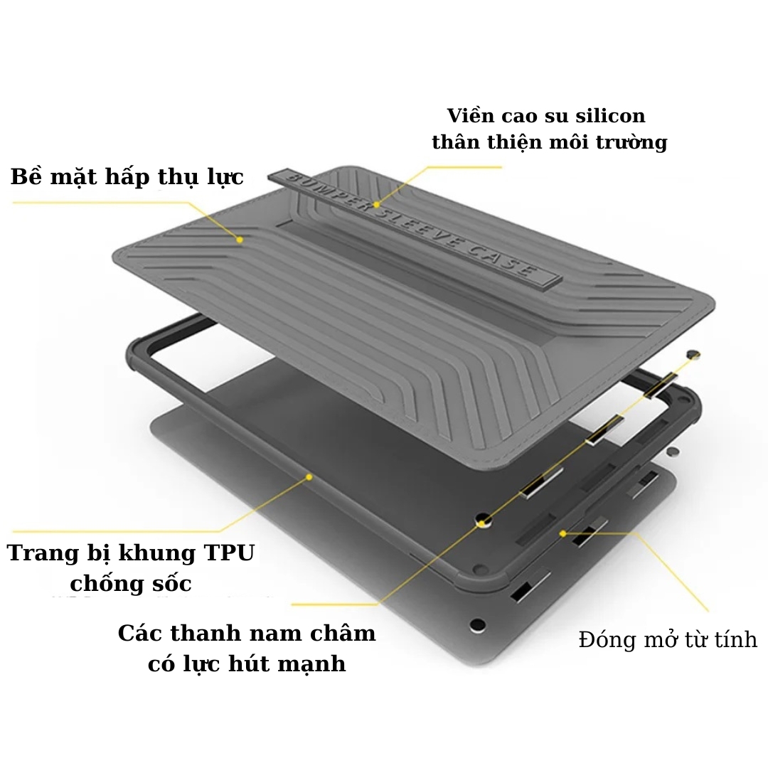 - Nắp đóng nam châm giúp túi tự động đóng lại khi không sử dụng, đảm bảo an toàn và dễ dàng lấy MacBook ra ngoài khi cần thiết.