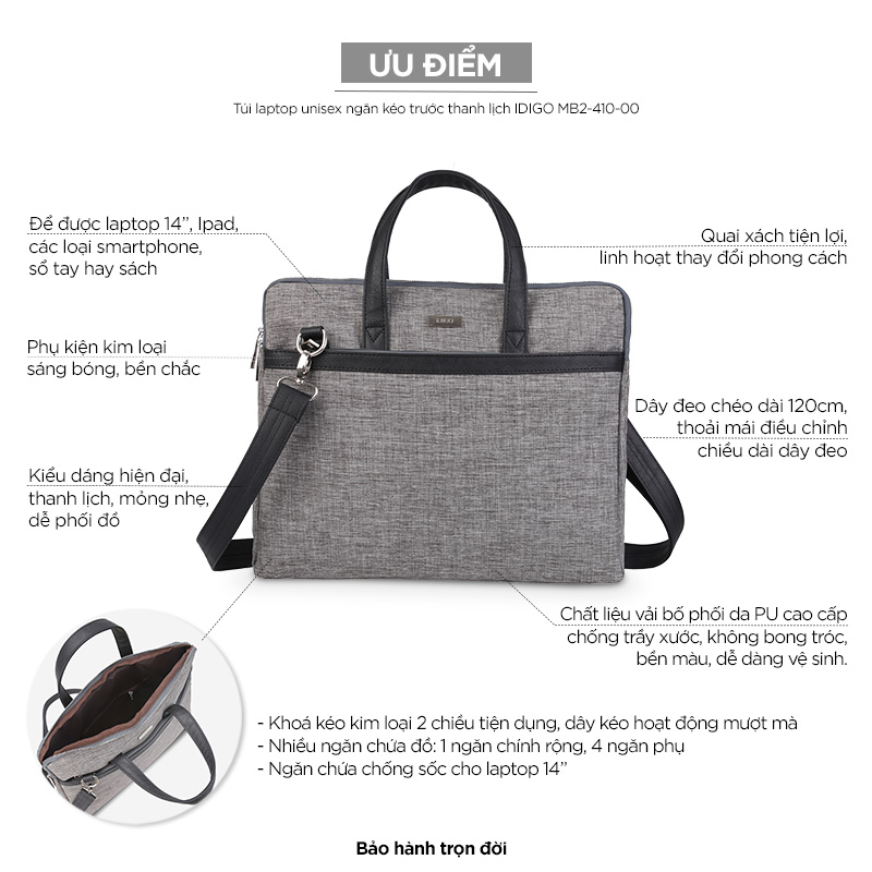- ChiếcTúi laptop unisex 14" ngăn kéo trước thanh lịch này là người bạn đồng hành đáng tin cậy và tiện dụng với các bạn. Với kiểu túi này, các bạn có thể xách tay hoặc sử dụng dây đeo 1 bên vai hoặc đeo chéo tùy theo thói quen của mình.