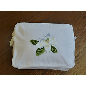 Mua tại TiktokTúi đựng trang điểm Mẫu : HOA MỘC LAN TRẮNG Vải: linen Màu: trắng Kích thước chung: Cao 16 x Ngang 23 x Dầy 7 cm Hình dạng: chữ nhật, có lót bên trong, dây kéo phía trên. Trọng lượng tịnh: 40 gr
