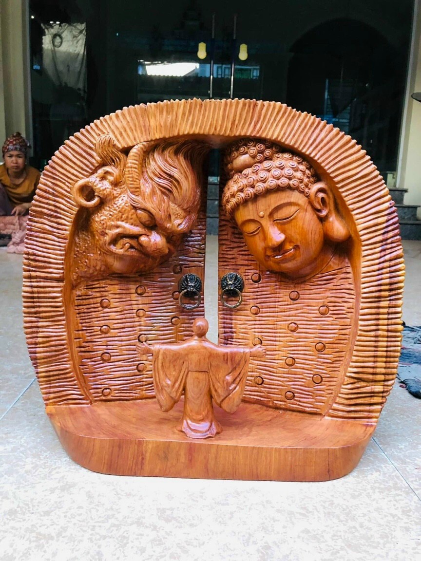 _ Tượng cánh cửu thiện ác được trạm khắc vô cùng tỉ mỉ tinh sảo kỳ công .Đi hầu hết tất cả mọi chi tiết góc ngách nội dung hoa văn của tượng đều được ngọt tỉa chỉnh sửa hoàn toàn bằng tay thủ công .Đồng thời tượng được kiểm định kỹ lưỡng như cho vào thẩm sấy cho gỗ khô kiệt .Mục đích trống dập nứt vênh mo mối mọt .Kết hợp với trà nhám ,đánh giấy giáp nhiều lần cho sạch sẽ ,sờ mát lạnh rồi cho vào phun lót làm bóng mờ ,để giữ lại mầu sắc vân gỗ tự nhiên ,Tượng cánh cửa được làm và hoàn thiện do bàn tay khối óc tài hoa ,Từ những người thợ gìau kinh nghiệm ,cũng như tay nghề cao trong làng nghề truyền thống .Chính vì thế tượng cánh cửu đã đáp ứng đầy đủ những tiêu trí ( Đẹp bền rẻ ) Thẩm mỹ nghệ thuật với chất lượng tuyệt vời