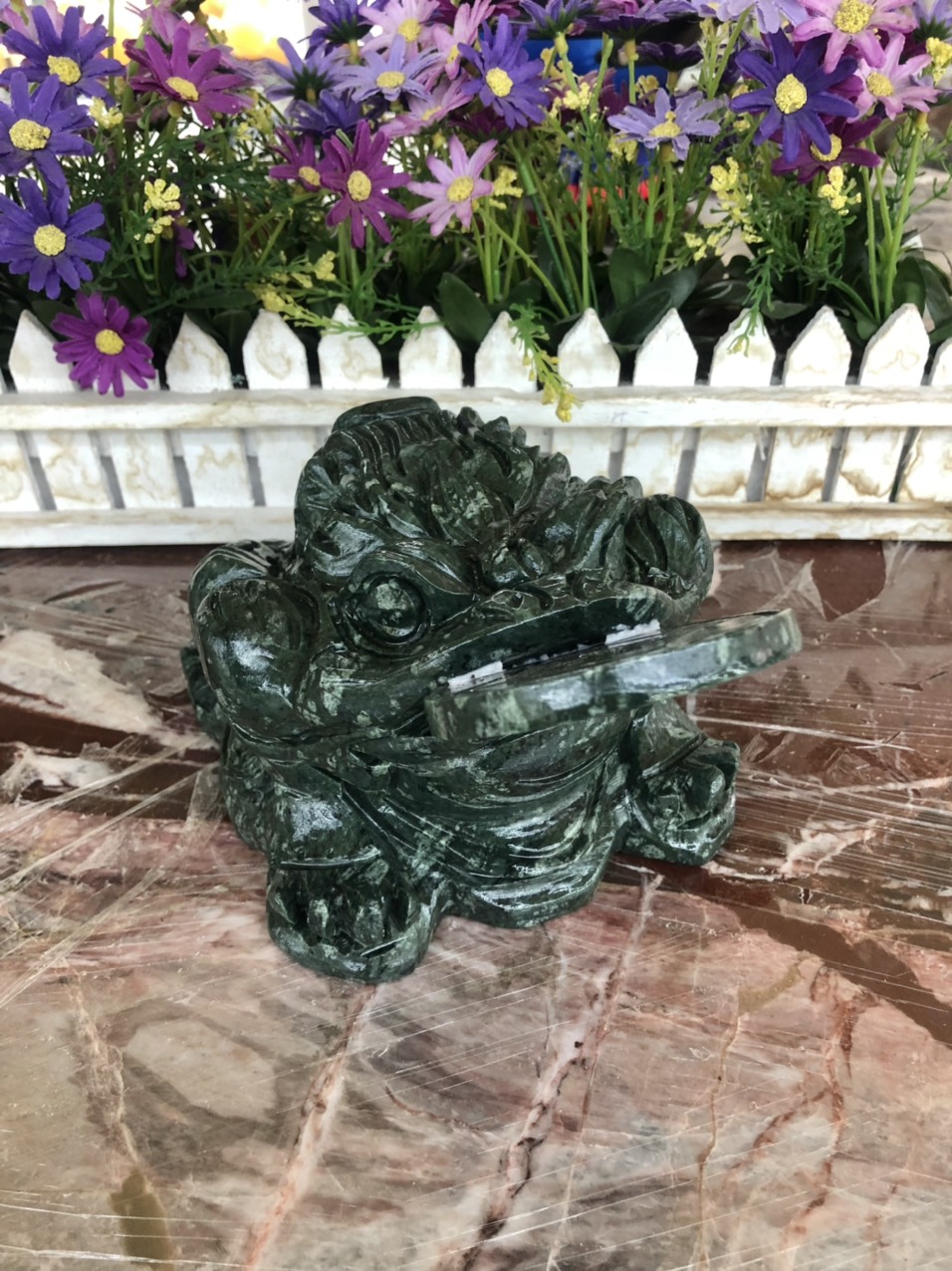 Chất liệu: Đá cẩm thạch vân gỗ Kích thước: Dài 9cm x Rộng 7cm x Cao 9,5cm Khối lượng: 1,13 kg Thiềm Thừ được người xưa gọi là Cóc tài lộc, Cóc ba chân hay