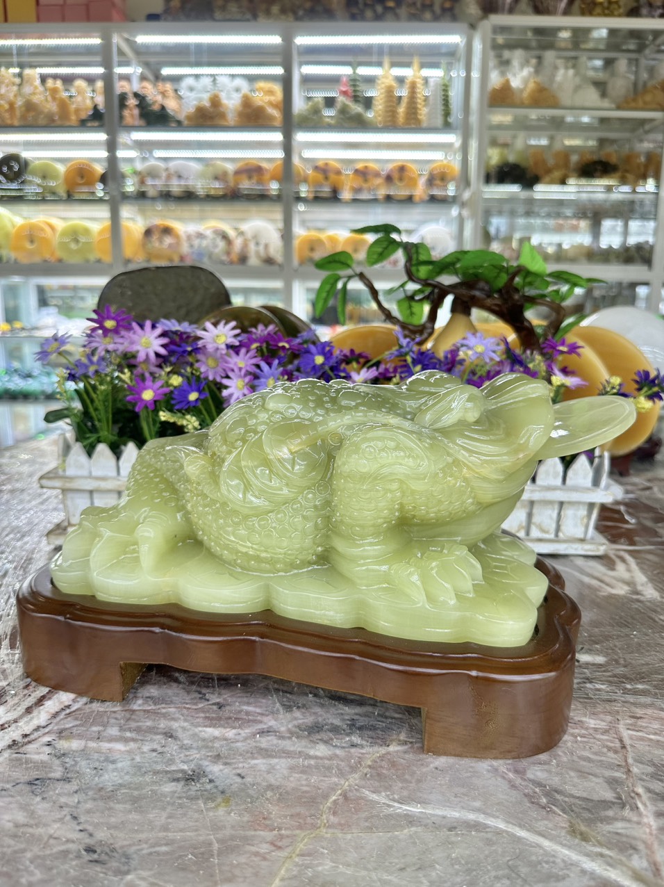 Mua tại TiktokKích thước: Dài 11 cm x Rộng 7 cm x Cao 15 cm Khối lượng: 3,6 kg Chất liệu: Đá trắng Vị trí đặt: Bàn làm việc, Phòng khách, Cửa hàng, Công ty, Bàn thờ.