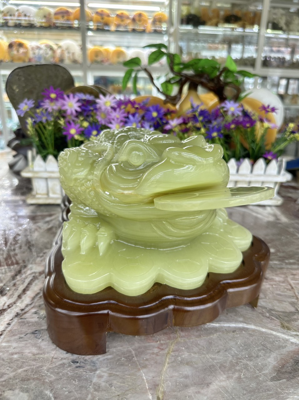 Mua tại TiktokChất liệu: Đá ngọc Onyx Kích thước: Dài 35 cm x Rộng 26 cm x Cao 18 cm Khối lượng: 11 kg Thiềm Thừ được người xưa gọi là Cóc tài lộc, Cóc ba chân hay Cóc Thiềm Thừ. Đây là một trong những vật phẩm phong thủy chiêu tài tốt nhất mang lại điềm lành về tài lộc và bình an cho chủ sở hữu. Vị trí đặt: Phòng khách, bàn thờ Thần tài, trên quầy thu ngân, bàn làm việc, két sắt, bàn lễ tân của công ty.