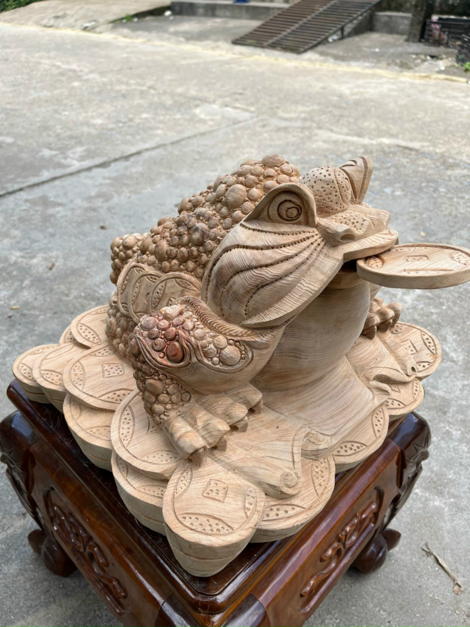 Cóc thiềm thừ ngậm tiền vàng được làm bằng chất liệu gỗ ngọc am liền khối thơm phức tự nhiên 100% Kích thước 40×38×31cm _ Cóc thiềm thừ ngậm tiền vàng được điêu khắc trạm trổ ,vô cùng tỉ mỉ ,Tinh sảo kỳ công .Đi hầu hết tất cả mọi chi tiết góc ngách nội dung hoa văn của tượng .Đều được gọt tỉa chỉnh sửa sắc nét hoàn toàn bằng tay thủ công .Đồng thời tượng cóc thiềm thừ được kiểm định kỹ lưỡng ,khắt khe như cho vào thẩm sấy cho gỗ khô kiệt .Mục đích trống dập nứt vênh mo mối mọt .Kết hợp với trà nhám ,đánh giấy giáp nhiều nước sờ mát lạnh ,Rồi cho vào phun lót làm bóng mờ để giữ lại mầu sắc vân gỗ tự nhiên .Hay để mộc như ảnh trên Tượng được làm và hoàn thiện do bàn tay khối óc tài hoa ,Từ những người thợ giàu kinh nghiệm ,cũng như tay nghề cao trong làng nghề truyền thống .Chính vì thế tượng cóc thiềm thừ ngậm tiền vàng đã đáp ứng đầy đủ mọi tiêu trí ( Đẹp bền rẻ ) Thẩm mỹ nghệ thuật với chất lượng tuyệt vời
