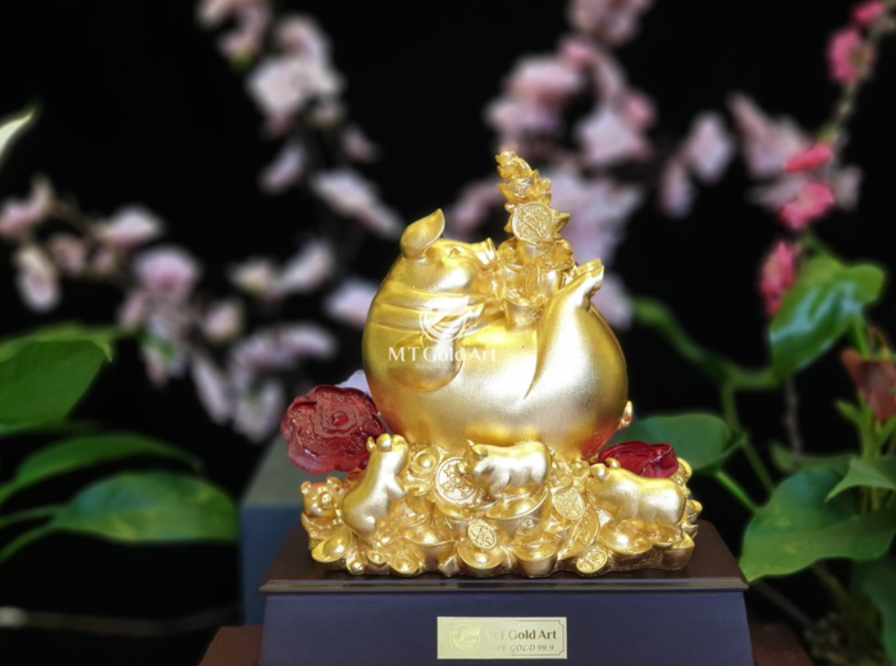 Tượng heo dát vàng 24k là sản phẩm quà tết độc đáo, sang trọng, ý nghĩa. Với hình ảnh chú lợn đang thong dong đi trên đống tiền là biểu trưng cho một năm mới nhiều tiền tài, may mắn, cuộc sống an nhiên. Chú heo là biểu tượng của tuổi hợi và được gọi là con lợn vàng mang đến may mắn, tài lộc. Tượng heo dát vàng 24k là món quà tết sang trọng, ý nghĩa tặng khách hàng, bố mẹ.