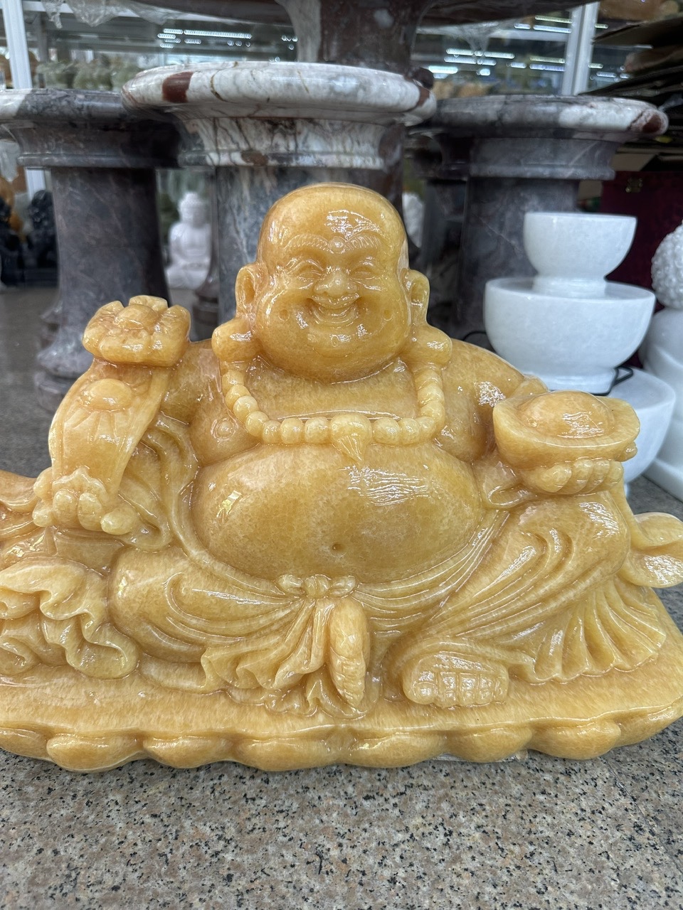 Chất liệu: Đá ngọc Hoàng Long Kích thước: Dài 50 cm x Rộng 20 cm x Cao 34 cm Khối lượng: 40 kg Phật Di Lặc trong Phong thủy Còn gọi là "Phật Cười", Di