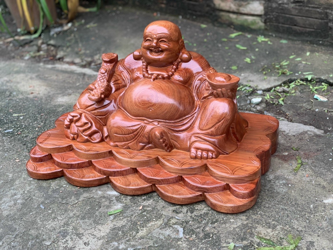 Mua tại TiktokTượng phật di lặc ngồi đế tiền được làm bằng chất liệu gỗ hương đá tữ nhiên 100% Kt 50×31×27cm _ Tượng phật di lặc ngồi đế tiền được điêu khắc trạm trổ ,vô cùng tỉ mỉ ,tinh sảo kỳ công .Đi hầu hết tất cả mọi chi tiết góc ngách nội dung hoa văn của tượng ,đều được gọt tỉa chỉnh sửa sắc nét hoàn toàn bằng tay thủ công .Đồng thời tượng được kiểm định kỹ lưỡng khắt khe ,như cho vào thẩm ,sấy cho gỗ khô kiệt .Mục đích trống dập nứt vênh mo mối mọt .Song rồi cho vào trà nhám ,đánh giấy giáp nhiều nước ,sờ mát rồi cho vào phun lót làm bóng mờ để giữ lại mầu sắc vân gỗ tự nhiên .Tượng được làm và hoàn thiện do bàn tay khối óc tài tài hoa ,Từ những người thợ dầy rặn kinh nghiệm ,cũng như tay nghề cao trong làng nghề truyền thống .
