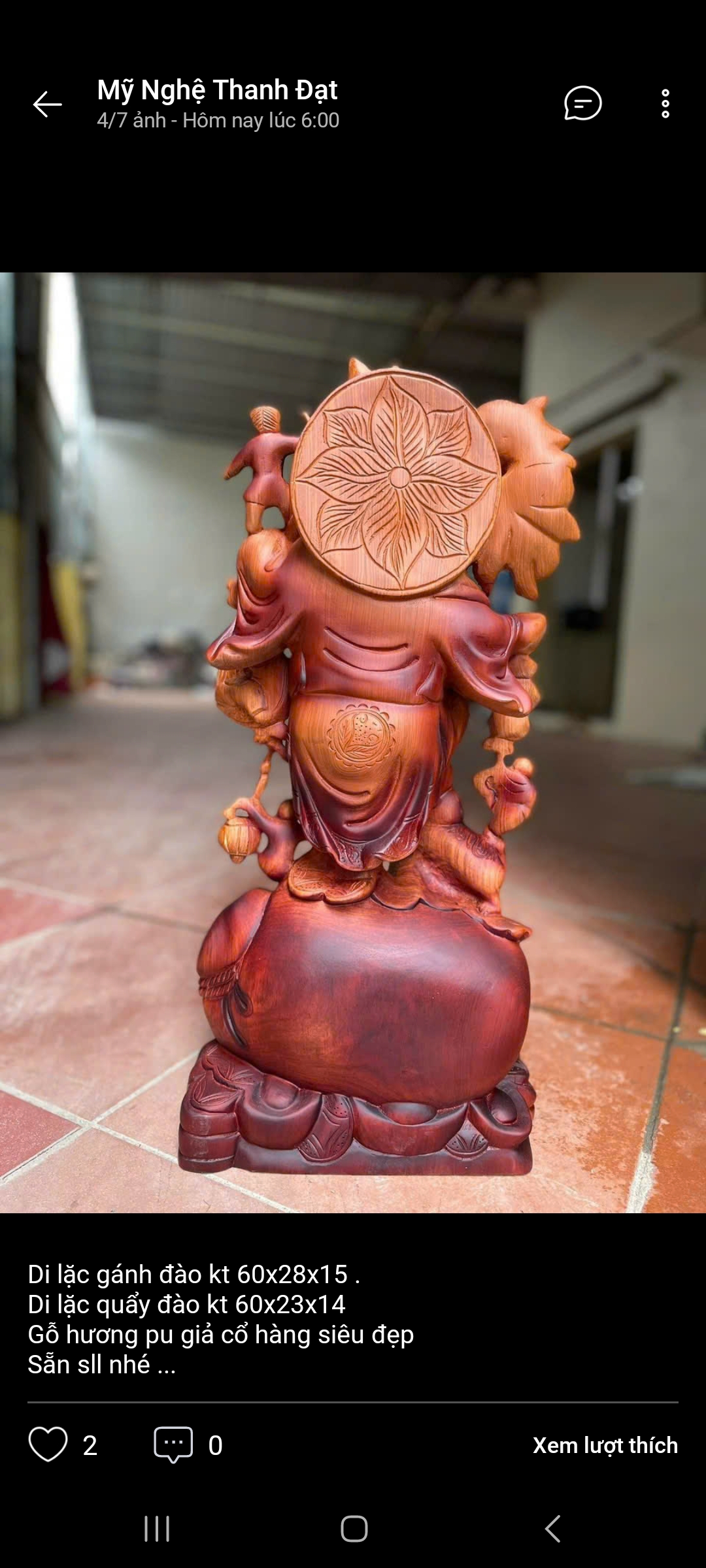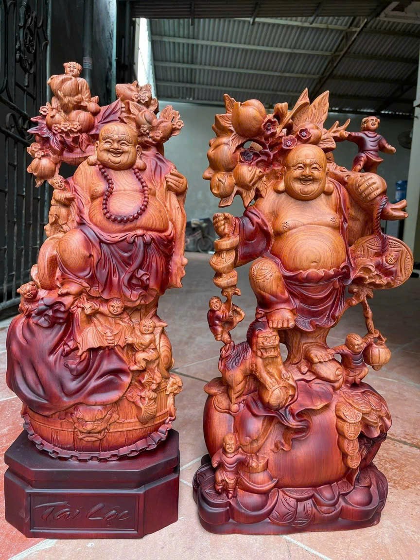 Tượng phật di lặc phong thủy vác  cành đào được làm bằng chất liệu gỗ hương đá liền khối tự nhiên 100%  Kt cao 60×28×15cm  _ Tượng được chạm khắc tỉ mỉ ,tinh xảo kỳ công .Đi hầu hết tất cả mọi chi tiết góc ngách nội dung hoa văn của tượng đều được gọt tỉa chỉnh sửa sắc nét hoàn toàn bằng tay thủ công .Đồng thời tượng được kiểm định kỹ lưỡng khắt khe,như cho vào thẩm sấy cho gỗ khô kiệt .Mục đích chống dập nứt vênh mo mối mọt .Kết hợp với trà nhám ,đánh giấy giáp nhiều nước sờ mát lạnh .Song cho vào phun lót làm bóng mờ để giữ lại mầu sắc vân gỗ tự nhiên .Cũng như pu dát vàng cao cao cấp đẹp long lanh như ảnh trên .Tượng được làm và hoàn thiện do bàn tay khối óc tài hoa .Từ những người thợ dầy dặn kinh nghiệm ,cũng như tay nghề cao làng nghề truyền thống