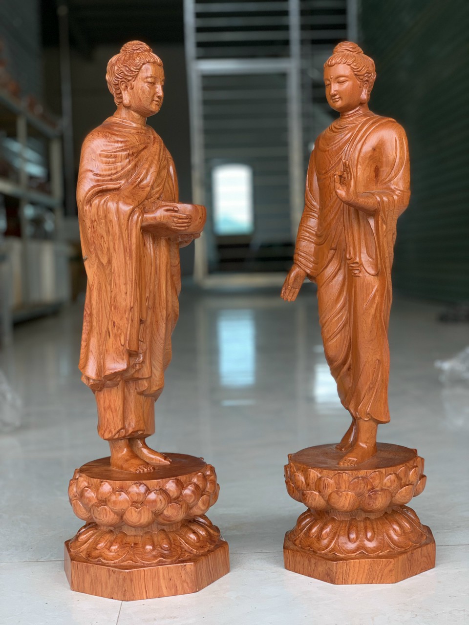 tượng phật thích ca khất thực đứng đài sen và trên cục đá