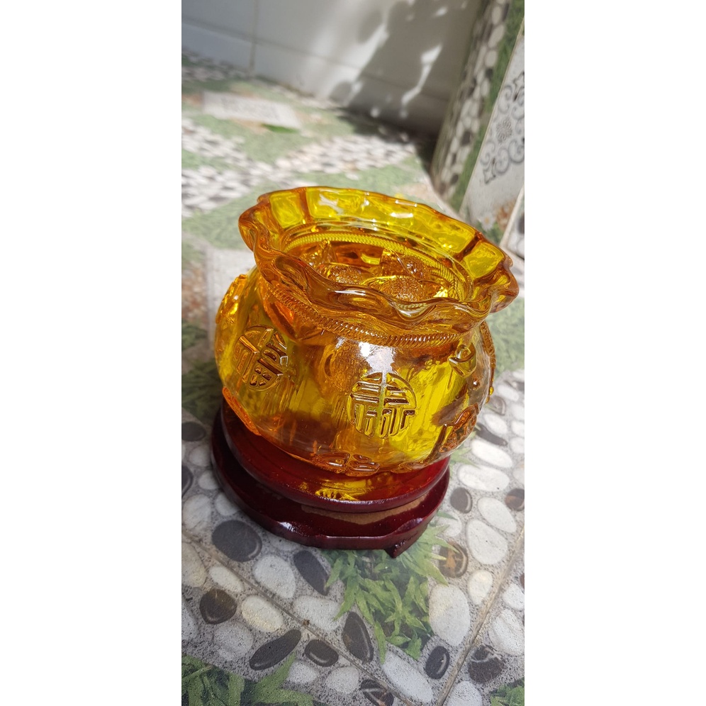 Thố tụ tài to mới miệng kiểu màu vàng anh tài lộc 20 thỏi xiền vàng đá lưu ly tự nhiên đế gỗ Size lớn đk 13cm x Cao 13cm cả đế x thố cao 9cm