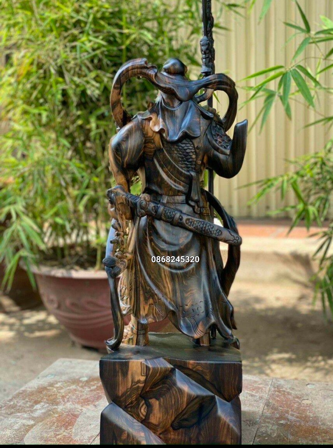 _ Tượng quan công cầm đao trấn ải được làm bằng chất liệu gỗ mun hoa liền khối tự nhiên 100%
