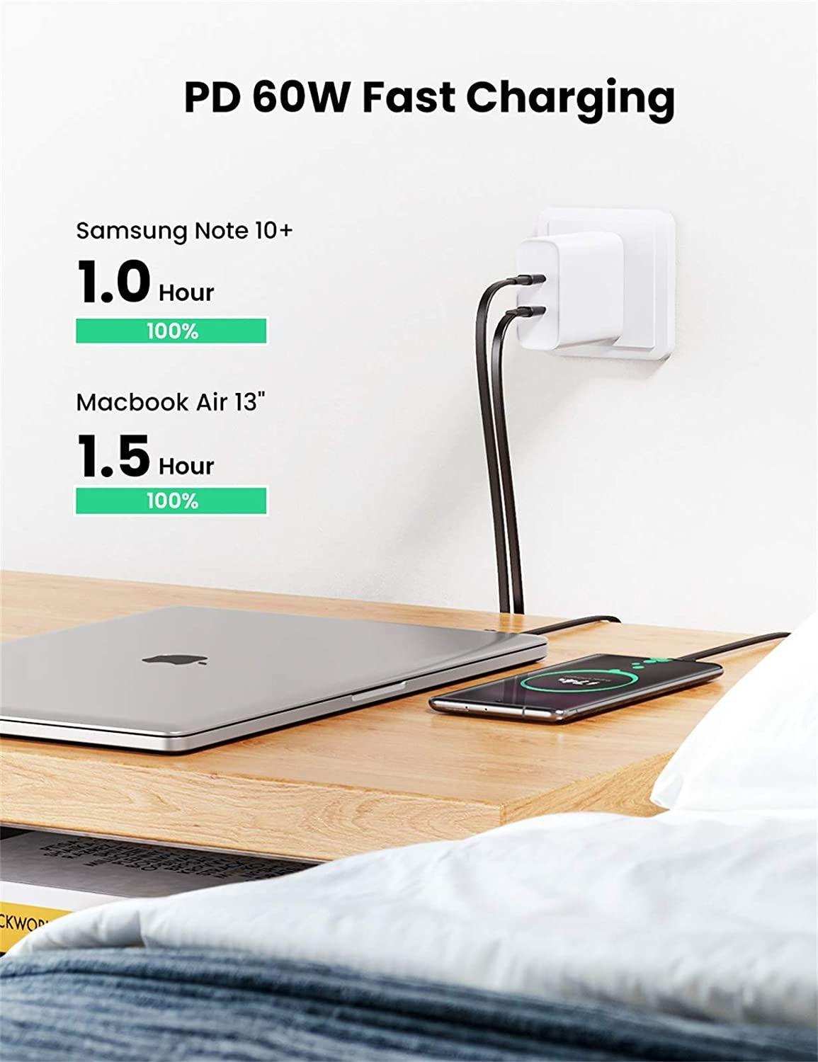 1. The USB C to USB C Power Cable delivers max 60W(20V/3A) fast charging to Type C/Thunderbolt 3 laptops/tablets/phones, when paired with 96W/87W/65W/45W/18W USB Power Delivery charger. Fully recharge MacBook Air 13" in 1.5h, as