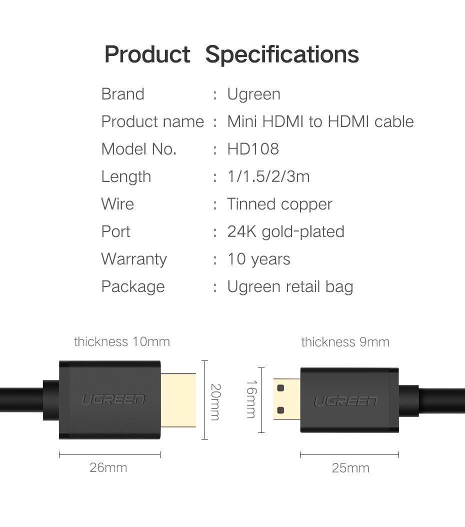 Ugreen 10195 1M Mini Hdmi To Hdmi Cable 1.4 Hd108 1. Cable length: 1M 2. Support high speed signal transmission up to 10.8Gbps. 3. Support Dolby TrueHD and DTS-HD Master Audio. 4. Add high-speed network