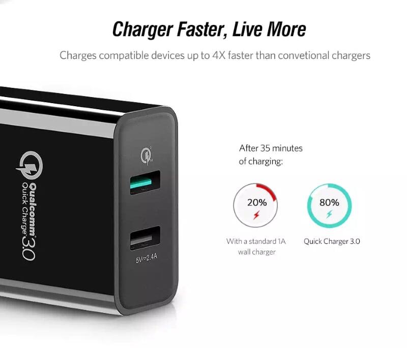 1. input: 100-240V ~ 50 / 60Hz 1.2A 2. Max 2xQuick Charge 3.0 Output: 5V / 3A 9V / 2A 12V / 1.5A 3. Output total power: 36W Max 4. Color: Black 5. 150g 6.