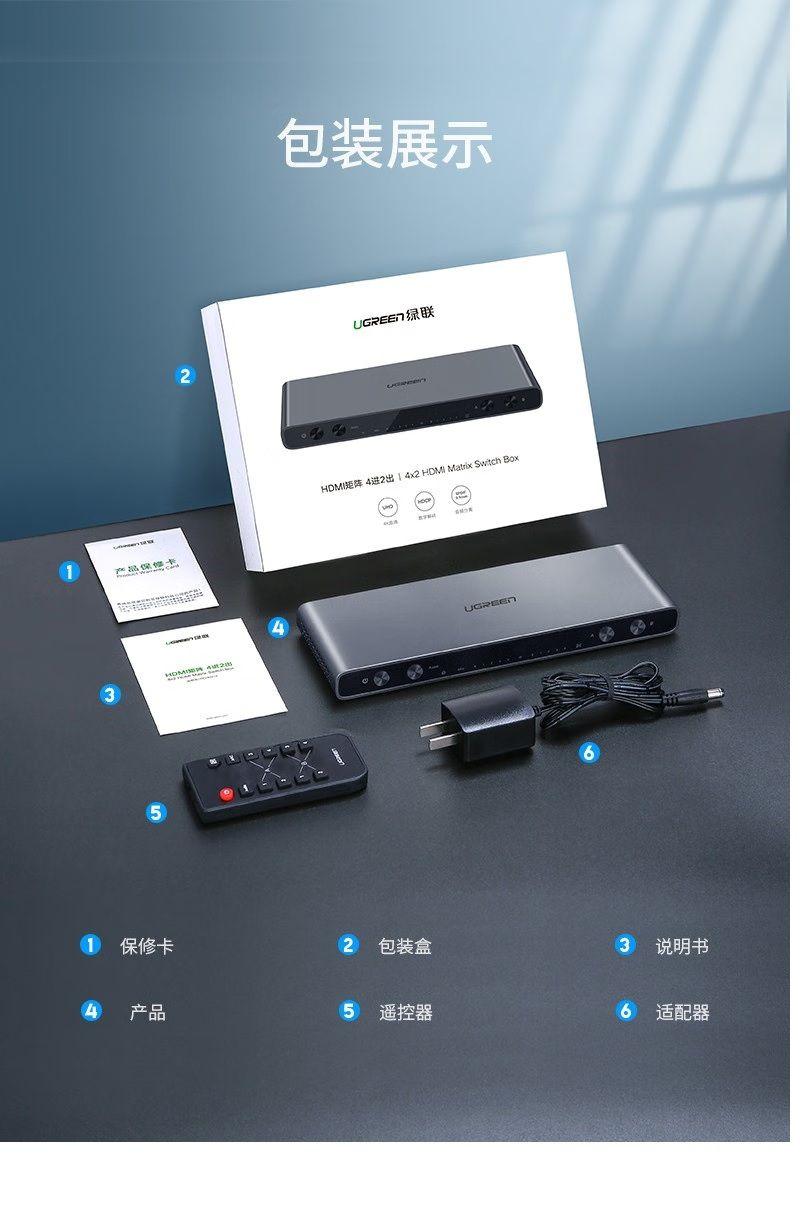 Ugreen 40216 "Hdmi Splitter 4*2Support 1080P & 3D" Black 40216 1. Features: Connect 4 HD broadcast devices sharing 2 screens. 2. Input: HDMI x4 3. Output: HDMI x2; Optical Audio Port (SPDIF) x1 and Audio