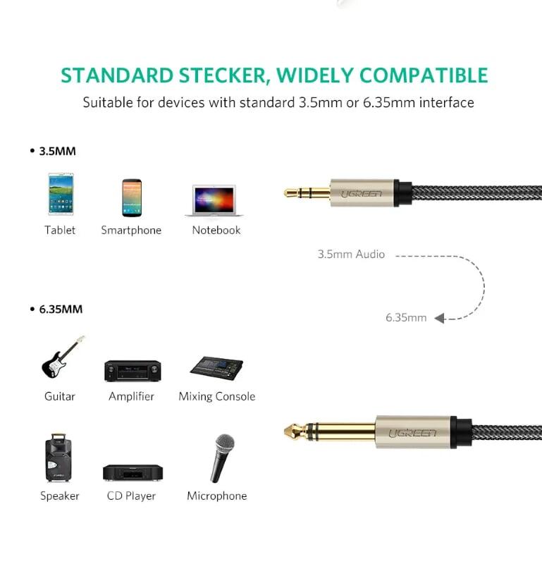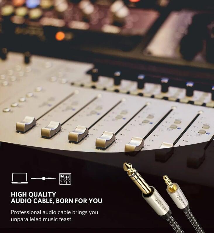 - Cáp Audio 3.5mm sang 6.5mm, Bọc Dù, Dài 5M - UGREEN 40806 là thiết bị phụ kiện cao cấp giúp bạn dễ dàng kết nối chia sẻ âm thanh giữa các thiết bị có cổng kết nối audio 3.5mm và 6.5mm với chất lượng âm thanh sống động tuyệt vời, chất liệu sợi cáp cao cấp mang đến độ bền và khả năng truyền tải tín hiệu nhanh chóng và ổn định nhất.