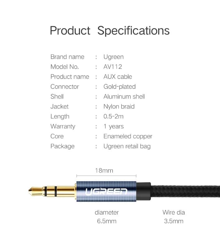 Ugreen 10737 3.5Mm Male To 3.5Mm Male Cable 5M AV119 1. Features: Cables for connecting phones, laptops, tablets with handsets. 2. Cable length: 5M 3. Color: Black 4. Jack: 2 * Audio 3.5mm Male. 5.