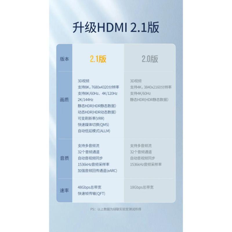 1. 8K resolution support at 60Hz and 4K resolution support at 120Hz for high-definition video and audio. 2. HDR (High Dynamic Range) support for improved color depth, contrast, and brightness. 3. Plug-and-play design, no additional