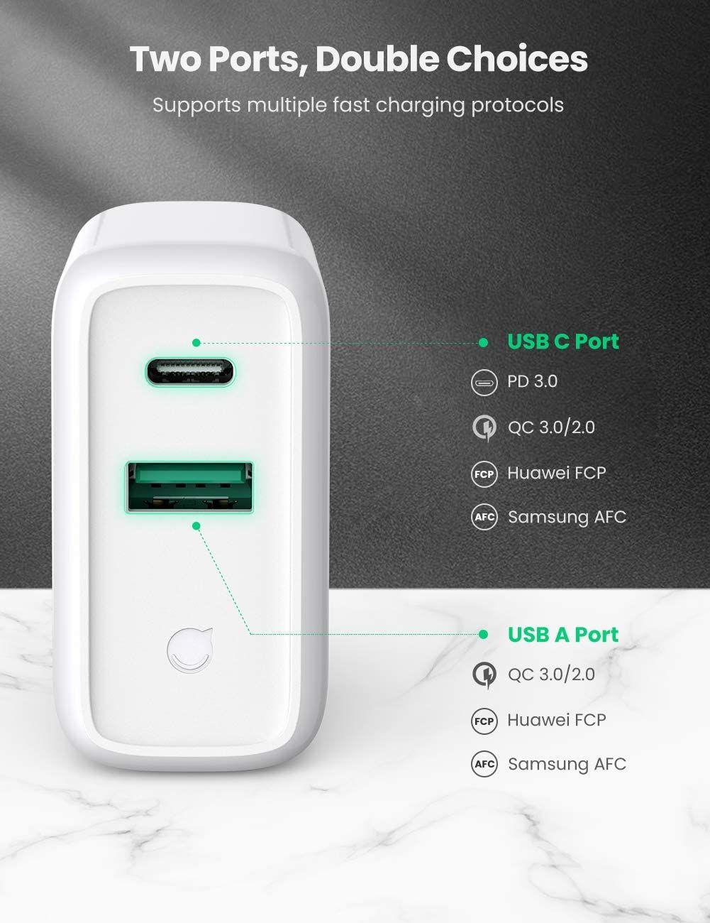 Ugreen 40715 Qc3.0 + Qc3.0 36W Dual Fcp Usb Charger Quick Charge White CD161 1. Input: 100-240V ~ 50 / 60Hz 1.2A 2. Max 2xQuick Charge 3.0 Output: 5V / 3A 9V / 2A 12V