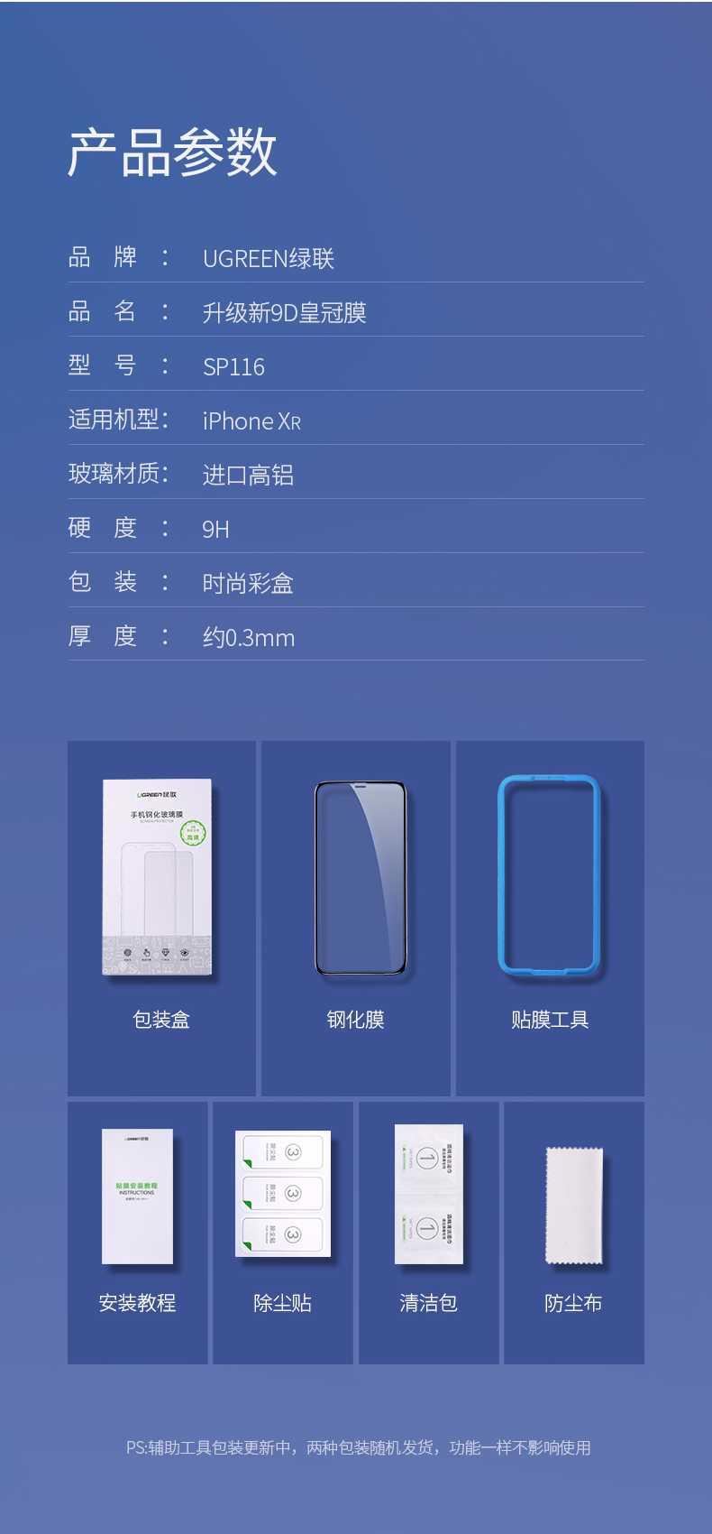 1. Brand : Ugreen 2. Name Protective Glass 3. Hardness : 9H 4. Thickness : 0.33mm 5. 20 x 10 x 5 cm 6. 200g