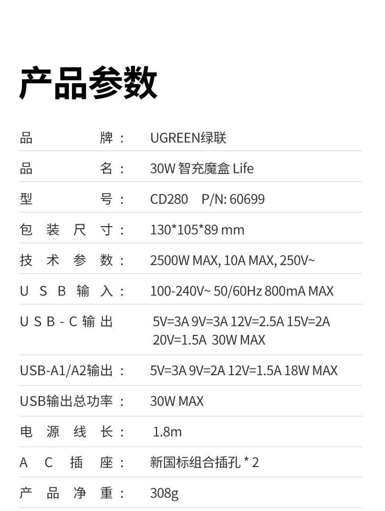 1. Input: 100-240V~50/60Hz 800mA Max 2. USB-C Output: 5.0V 3.0A/9.0V 3.0A/12.0V 2.5A/15.0 2.0A/20.0V 15A/3.3-11.0V 2.7A 3. Total Output Power: 30.0W Max