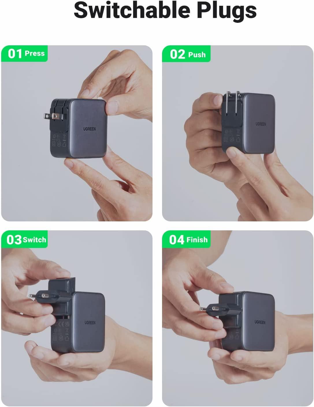 ✨Ugreen UG90409CD296TK 65W Bộ sạc nhanh Nexode GaN 2 cổng USB Type-C + USB-A Màu Đen kèm 3 chuẩn cắm US EU UK - HÀNG CHÍNH HÃNG