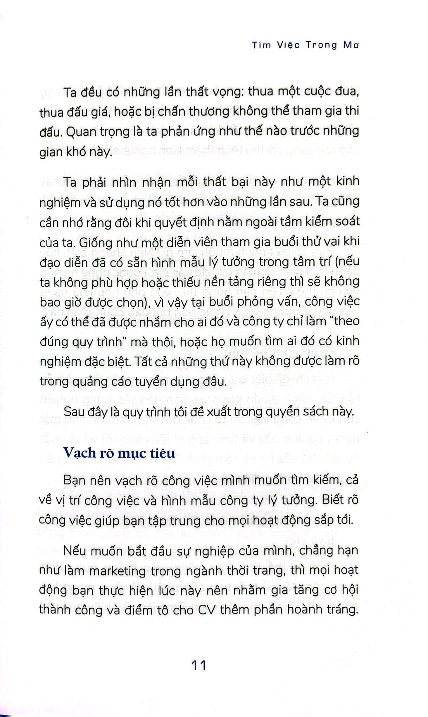 Trong thời buổi suy thoái đầy khó khăn này, tìm được công việc như ý là nỗi trăn trở của rất nhiều người. Ta loay hoay giữa quá nhiều lựa chọn, yêu cầu, đòi hỏi, và áp lực, rồi không biết phải làm gì, bắt đầu từ đâu. Trong Tìm Việc Trong Mơ, áp dụng liệu pháp phân tích tâm lý và ứng dụng các lý thuyết tâm lý vào quá trình tìm việc, tác giả Denise Taylor đã cung cấp rất nhiều thông tin và lời khuyên hữu ích, giúp ta biết cách đặt mục tiêu và vạch ra kế hoạch hoàn hảo cho công cuộc tìm việc của m.ình. Sau mỗi bài tập, mỗi ví dụ, ta ngày càng tiến bộ, hiểu rõ bản thân hơn, tiến gần hơn đến công việc mà m.ình mơ ước.
