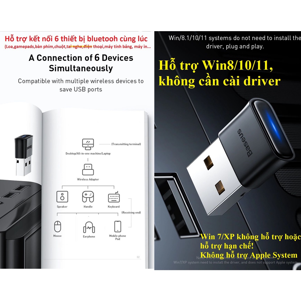 Mua tại TiktokUSB bluetooth / thiết bị tạo bluetooth cho máy tinh thương hiệu Baseus, model: BA04 -Công nghệ bluetooth V5.0, kết nối nhanh, ổn định, tương thích với BTV4.0. 4.1. 4.2 -Giới hạn kết nối lên đến 20m -Giúp kết nối máy tính không có bluetooth với các thiết bị bluetooth khác như tai nghe, chuột, bàn phím, máy in, máy tính bảng, điện thoại. -Hỗ trợ kết nối cùng lúc với 6 thiết bị -Hỗ trợ Win8/10/11 , không cần cài driver Khỗng hỗ trợ Win7 hoặc hỗ trợ hạn chế Không hỗ trợ Apple system -Bảo hành 1 tháng **Lưu ý: BAO BÌ TÚI NHỰA HAY HỘP GIẤY CÓ THỂ THAY ĐỔI TUỲ ĐỢT HÀNG!