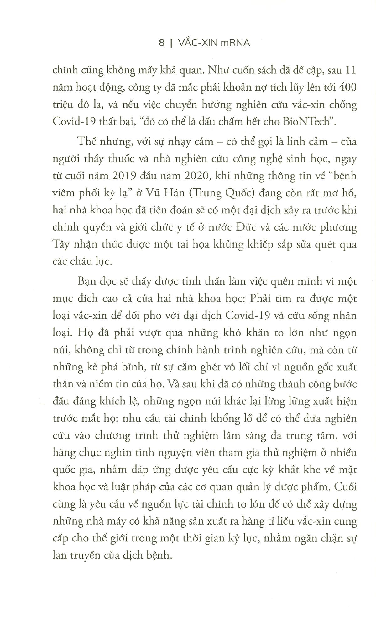 Qua cuốn sách Vắc-xin mRNA, người đọc có thể hiểu rõ hơn về các nhà khoa học, về những điều khó khăn họ phải trải qua, những sự hiểu lầm họ bị gán ghép. Để rồi công chúng sẽ có cái nhìn đúng đắn hơn, bản thân các nhà khoa học vững bước hơn trên con đường mình đã chọn, và thậm chí tốt hơn nữa, những con người trẻ sẽ được truyền cảm hứng để bước trên con đường ấy, nhằm đem lại thành tựu cho nhân loại.
