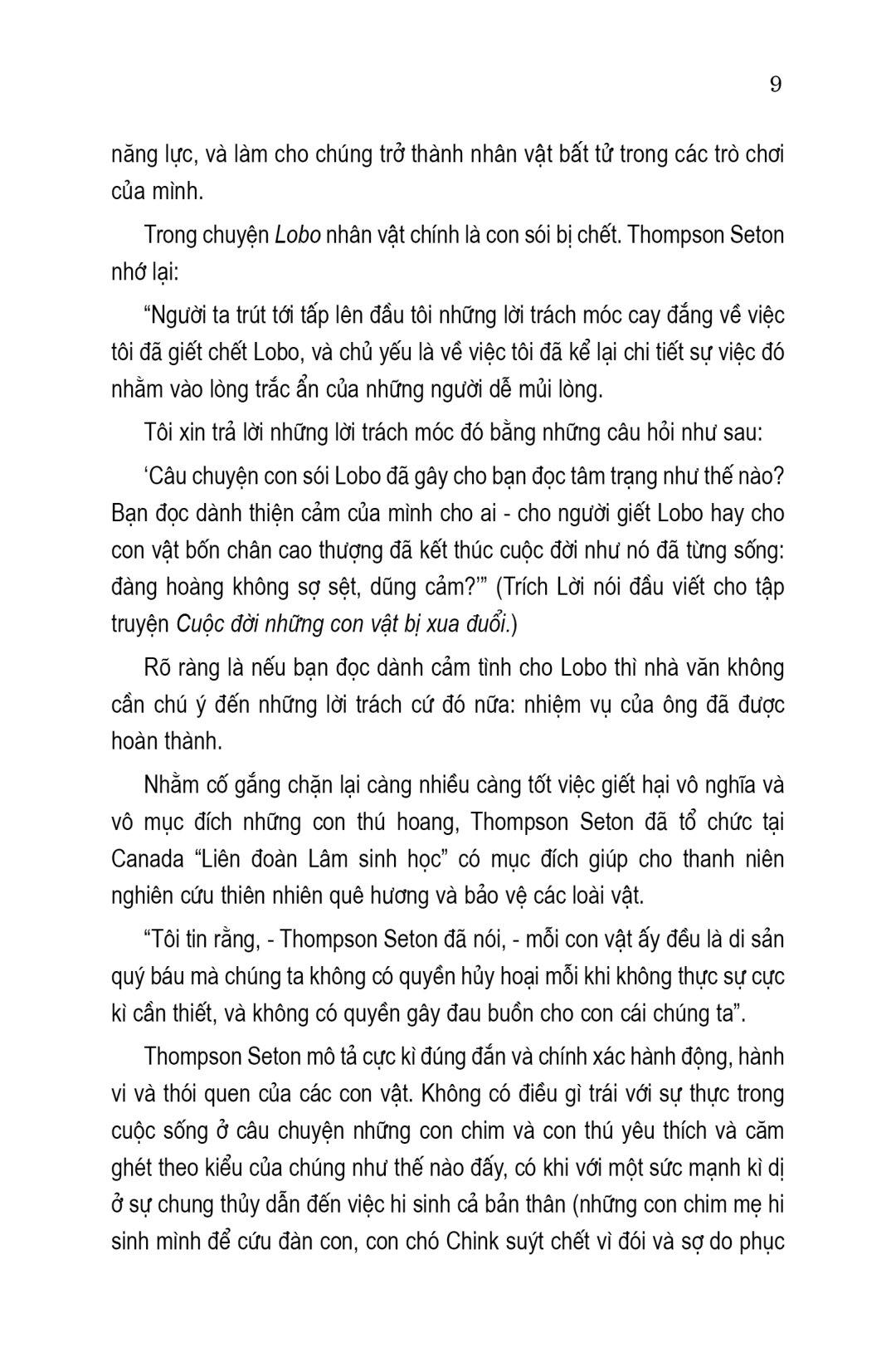 Thấm đẫm tình cảm và không thể thiếu đối với thiếu nhi, Truyện loài vật của Ernest Thompson Setoncho chúng ta thấy, mỗi loài vật là một người bạn quý giá, xứng đáng để con người yêu thương và trân trọng. Chỉ khi biết yêu và hiểu vẻ đẹp của thế giới tự nhiên, mỗi chúng ta mới có thể cảm nhận cuộc sống trọn vẹn.