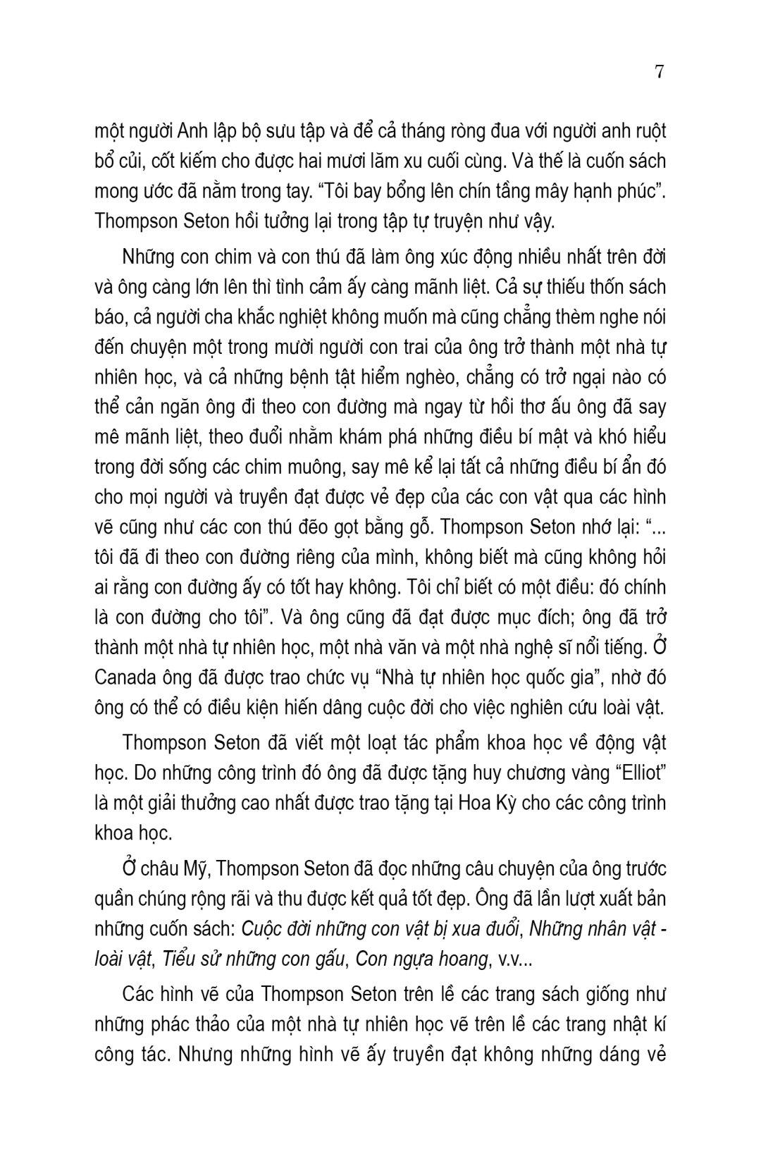 Truyện loài vật (Wild animals I have known, 1898) là cuốn sách đầu tiên đưa chim, thú lên làm nhân vật chính thực sự đã thành công rực rỡ. Tiếp theo, Seton viết một loạt tác phẩm khác và cũng lấy đề tài muông thú và đều được đón nhận nồng nhiệt. Ngoài ra, ông còn viết rất nhiều sách tham khảo giá trị về thế giới tự nhiên và đời sống của người da đỏ.