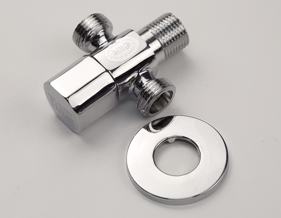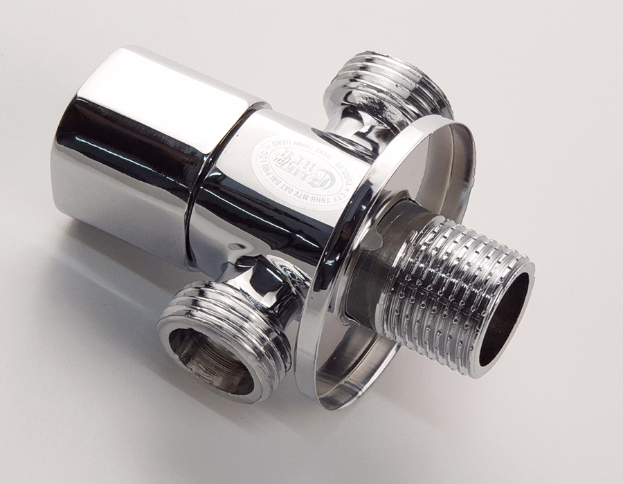 Van khóa chữ T chia hai đường nước 1 ngã cấp nước vào bồn cầu dây xịt vệ sinh, 1 ngã dùm để giảm áp lực nước Thân van được làm bằng đồng mạ chrome,