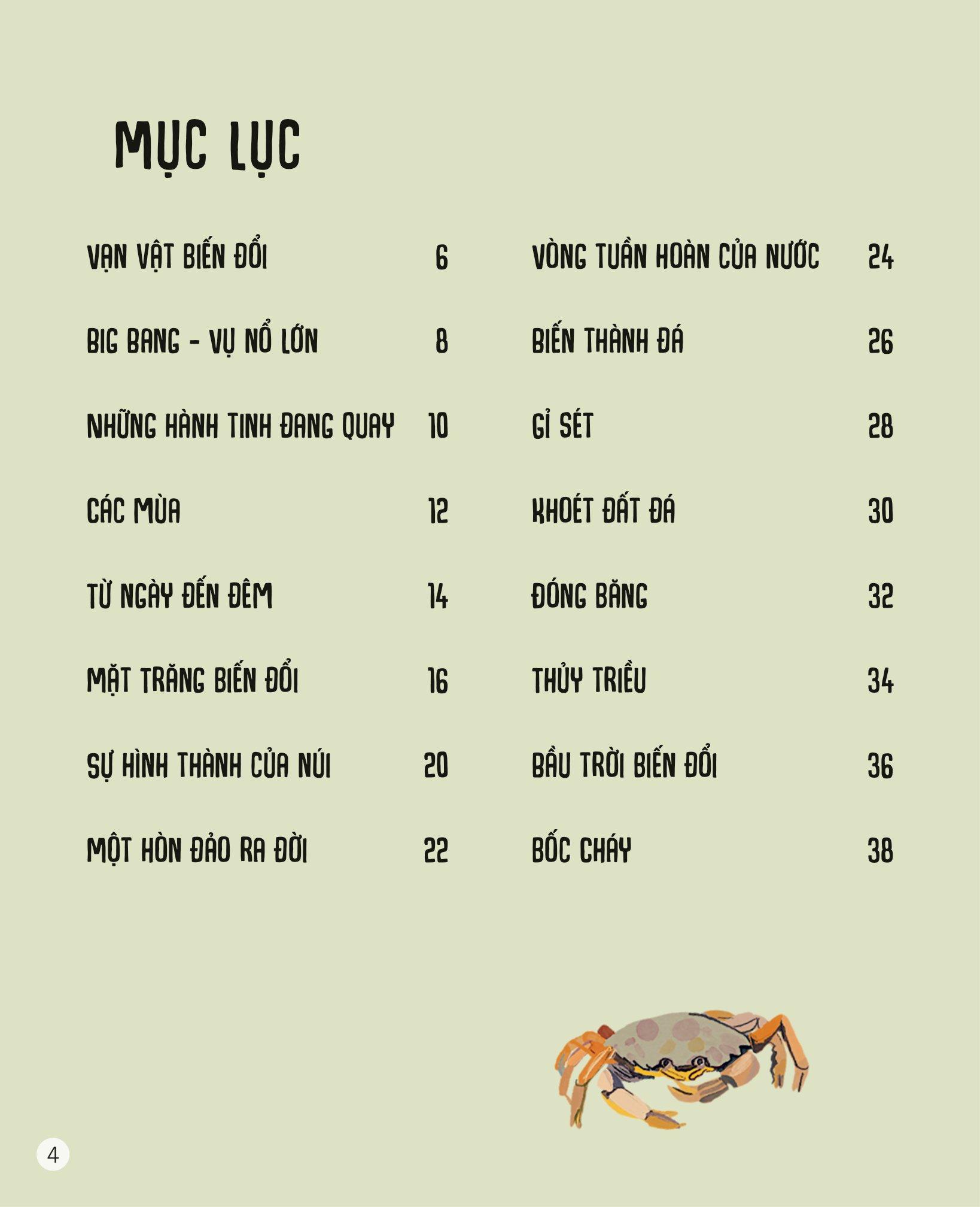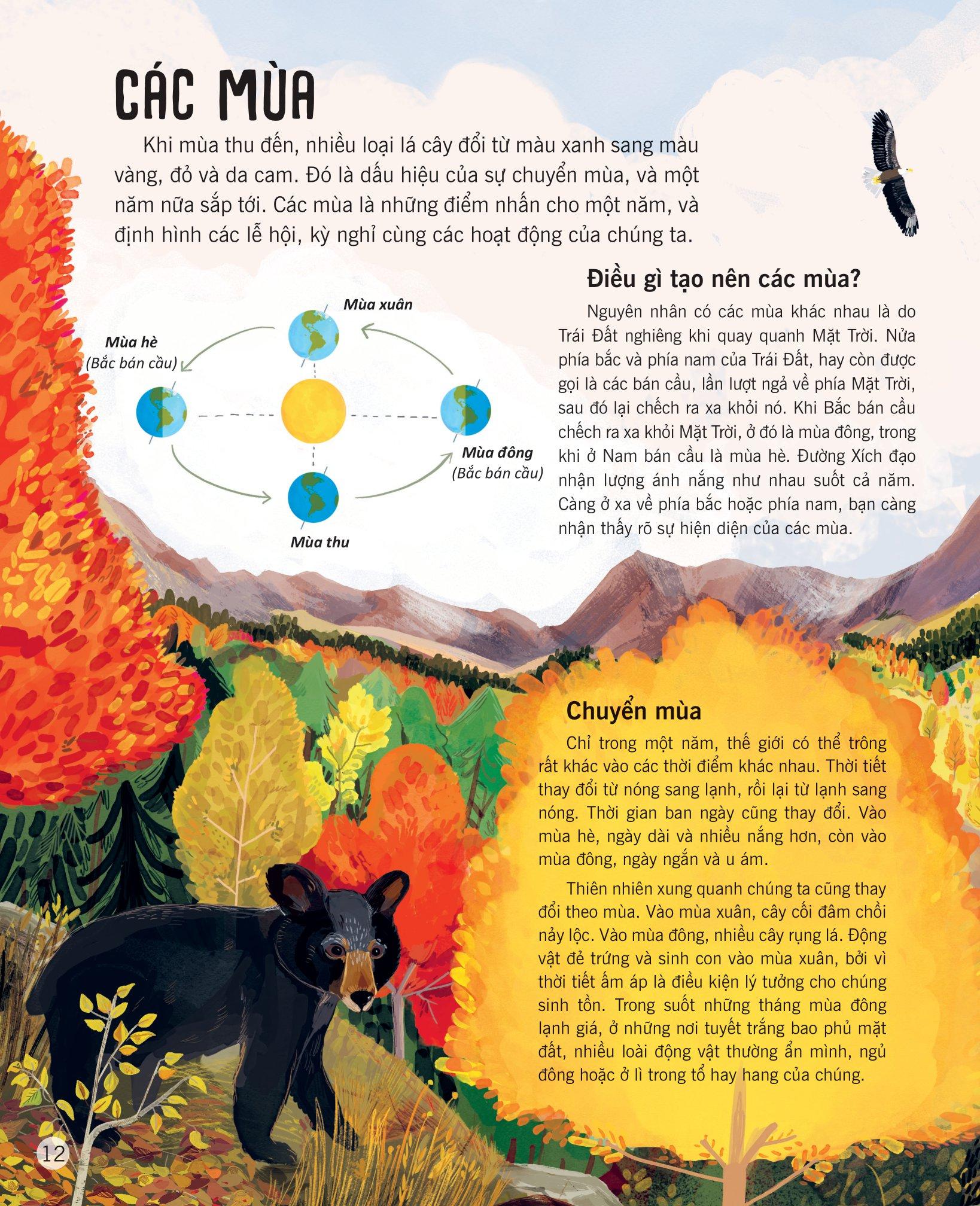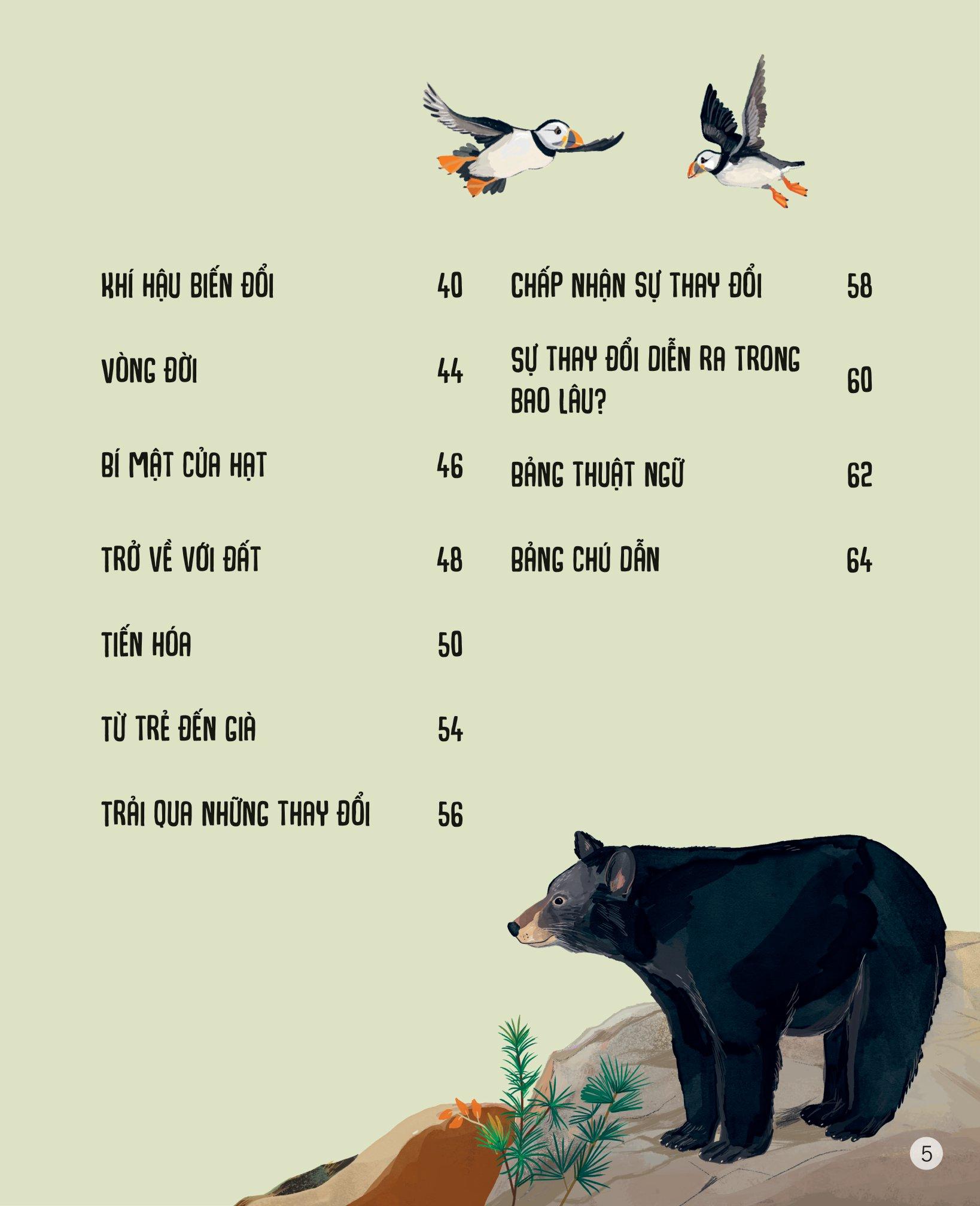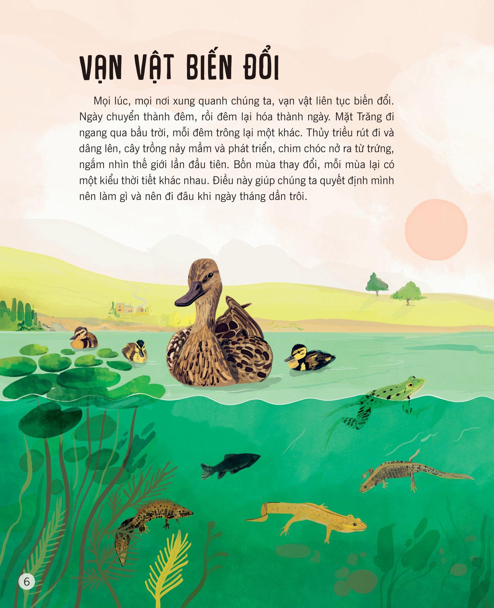 Vạn Vật Biến Đổi Mọi lúc, mọi nơi xung quanh chúng ta, vạn vật liên tục biến đổi. Ngày chuyển thành đêm, rồi đêm lại hóa thành ngày. Mặt Trăng đi ngang qua bầu trời, mỗi đêm trông lại một khác. Thủy triều rút đi và dâng lên, cây trồng nảy mầm và phát triển, chim chóc nở ra từ trứng, ngắm nhìn thế giới lần đầu tiên. Bốn mùa thay đổi, mỗi mùa lại có một kiểu thời tiết khác nhau. Điều này giúp chúng ta quyết định m.ình nên làm gì và nên đi đâu khi ngày tháng dần trôi.