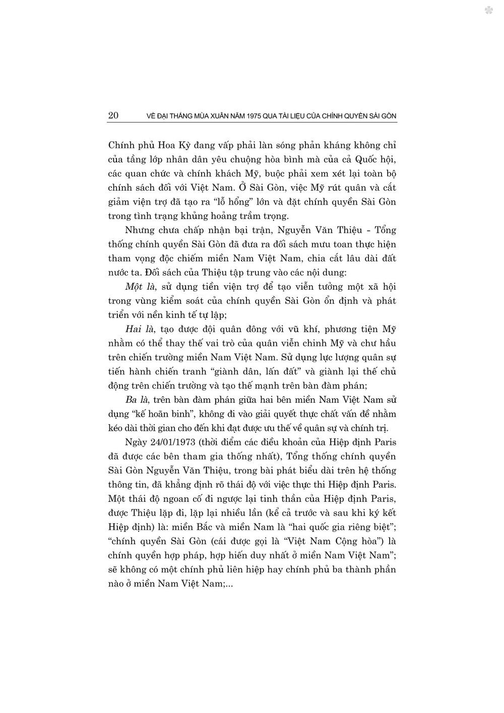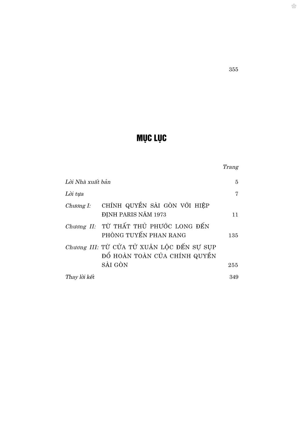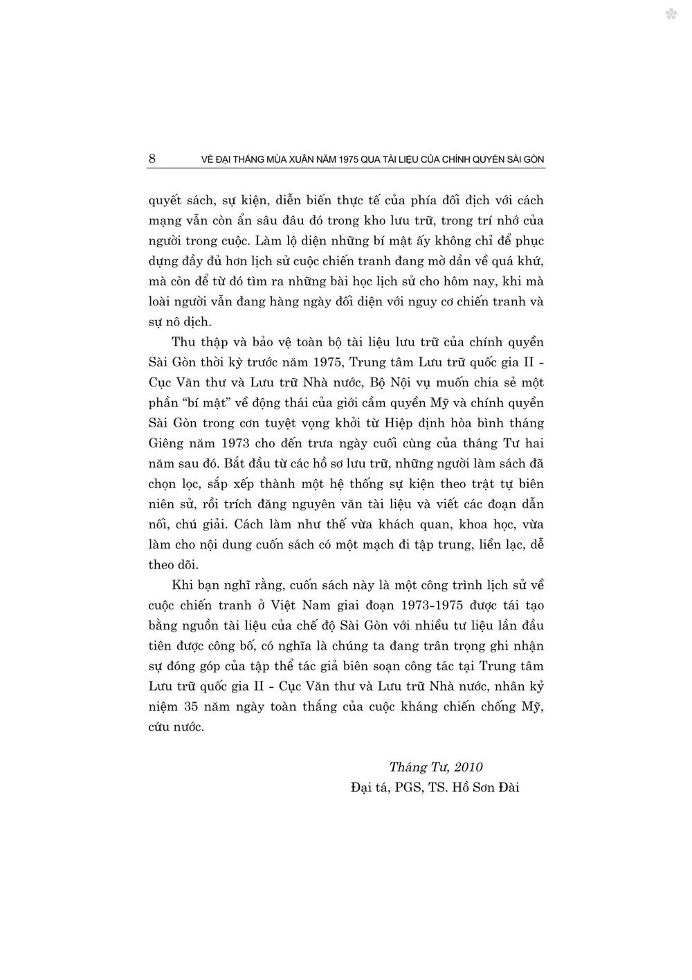 Cuốn sách do tập thể tác giả công tác tại Trung tâm Lưu trữ quốc gia II - Cục Văn thư và Lưu trữ Nhà nước, Bộ Nội vụ biên soạn, tuyển chọn trên cơ sở tập hợp những tài liệu của chính quyền Sài Gòn thu thập, ghi chép về những sự kiện lịch sử diễn ra trong giai đoạn từ khi Hiệp định Paris năm 1973 được ký kết đến kết thúc chiến dịch Hồ Chí Minh lịch sử, giải phóng hoàn toàn miền Nam năm 1975. Cho dù tư liệu mà chính quyền Sài Gòn và báo chí phía bên kia để lại đã không phản ánh đầy đủ về biên niên sự kiện, về nguyên nhân thất bại và những thương vong, tổn thất của họ kể từ sau khi Mỹ rút quân khỏi miền Nam, đặc biệt là trong cuộc Tổng tiến công và nổi dậy mùa Xuân năm 1975, nhưng lịch sử luôn được quy chiếu trên cơ sở các sự kiện và sự thật, do vậy, cuốn sách có giá trị tham khảo, giúp bạn đọc có được thêm tư liệu theo hướng tiếp cận khác, để qua đó càng hiểu thêm về ý nghĩa vĩ đại của Đại thắng mùa Xuân năm 1975.