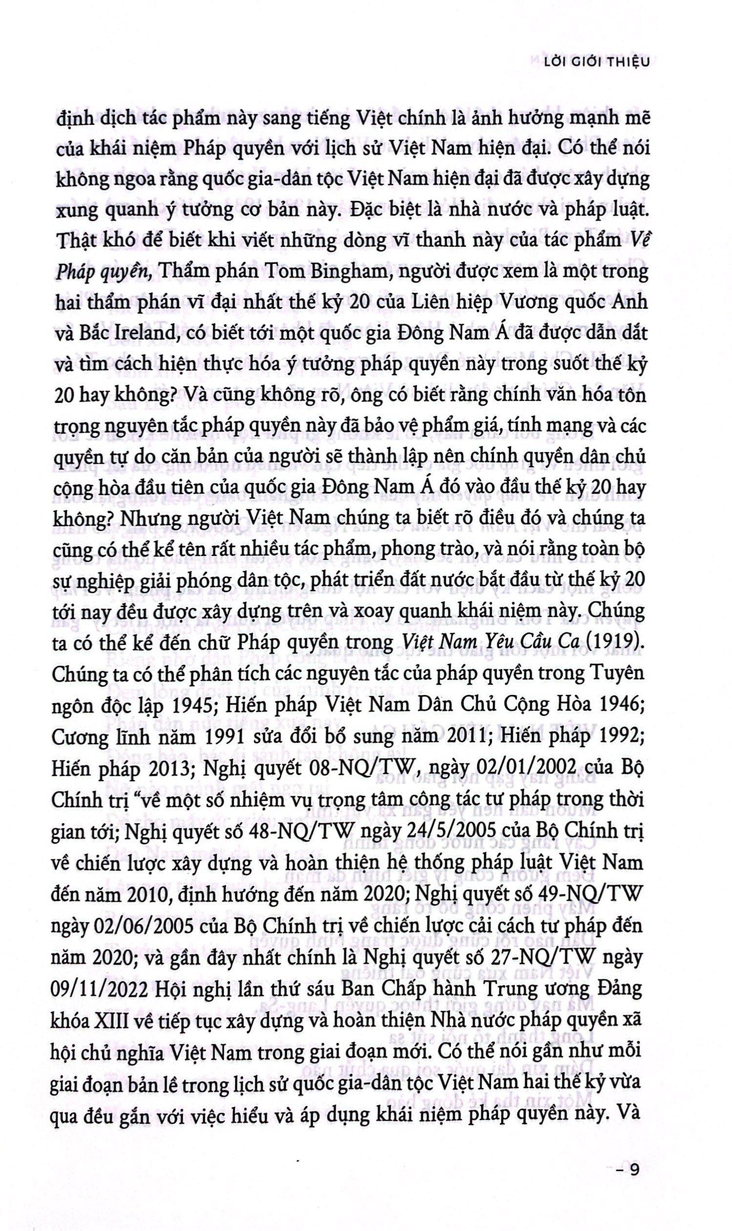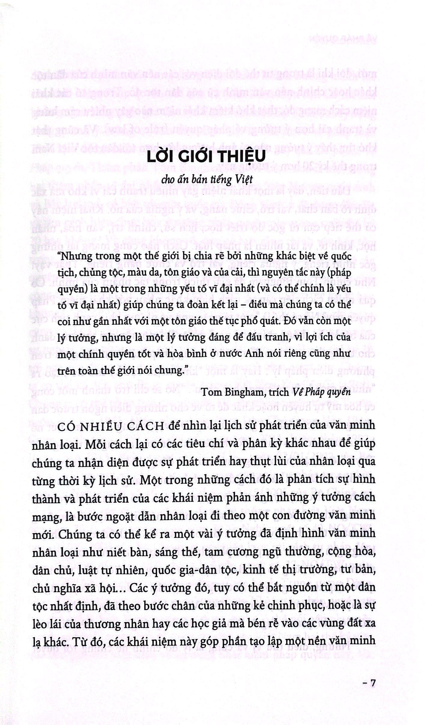 - Phần ba (Chương 11-12) thảo luận về những căng thẳng đối với pháp quyền từ chủ nghĩa khủng bố và nguyên tắc c.hủ quyền nghị viện (Anh). Pháp quyền là nền tảng của xã hội văn minh. Và theo lời tác giả “trong một thế giới bị chia rẽ bởi những khác biệt về quốc tịch, c.hủng tộc, màu da, tôn giáo và của cải, pháp quyền là một trong những yếu tố vĩ đại nhất (và có thể chính là yếu tố vĩ đại nhất) giúp chúng ta đoàn kết lại”. Có thể thấy pháp quyền, luật pháp là những tri thức căn bản cần có với mỗi công dân trong xã hội, chứ không chỉ riêng ai làm trong ngành Luật. VỀ TÁC GIẢ Tom Bingham (1933 – 2010) là người duy nhất từng đảm nhiệm 3 vị trí: Phụ trách phòng Dân sự thuộc Tòa phúc thẩm Anh và xứ Wales, Chánh án Tòa án Hoàng gia Tư pháp Anh và xứ Wales, Thượng nghị sĩ tối cao phụ trách vấn đề Pháp luật của Vương quốc Anh. Sauk hi nghỉ hưu năm 2008, ông tập trung giảng dạy, viết và diễn thuyết về các chủ đề pháp lý, đặc biệt là pháp luật về nhân quyền. Trung tâm Pháp quyền Bingham (Bingham Centre for the Rule of Law) ở Anh được đặt theo tên ông.